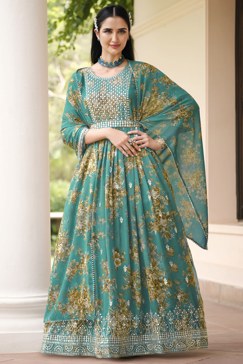 Georgette Fabric Cyan Color Festive Wear Printed Readymade Anarkali Salwar Kameez