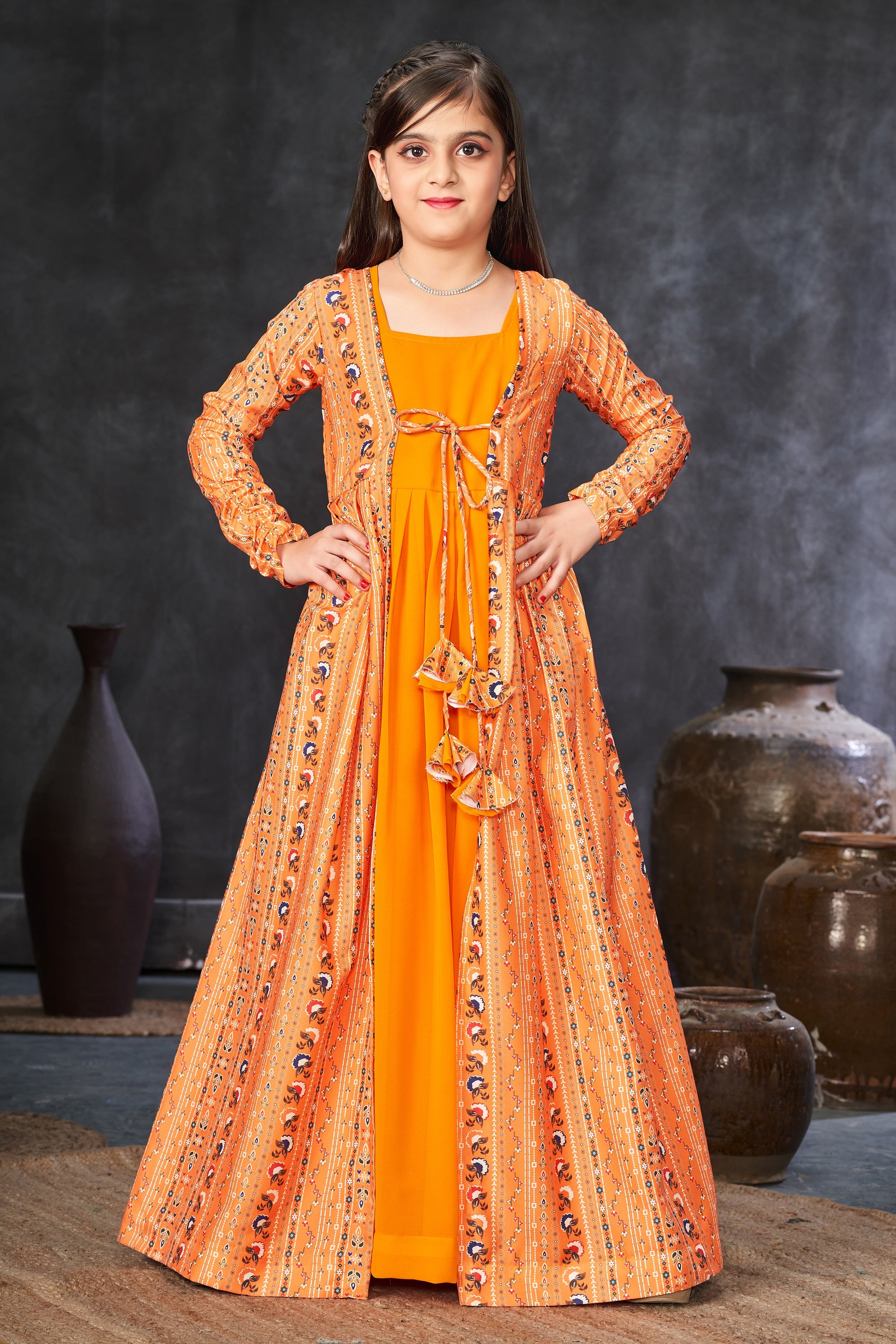 Georgette Fabric Engaging Orange Color Function Wear Digital Printed Readymade Kids Gown With Shrug