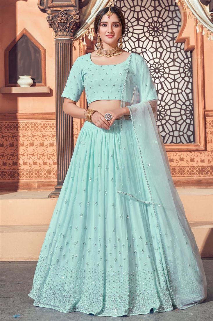 Georgette Fabric Wedding Wear Light Cyan Color Sequins Work Lehenga Choli