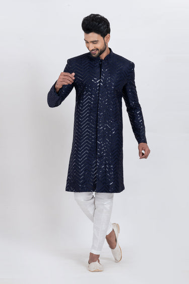 Glamorous Navy Blue Sequins Work Readymade Indo Western For Men In Viscose Fabric