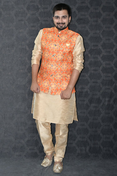 Gorgeous Art Silk Fabric Function Wear Readymade Kurta Pyjama For Men With Orange Color 3 Pcs Jacket Set