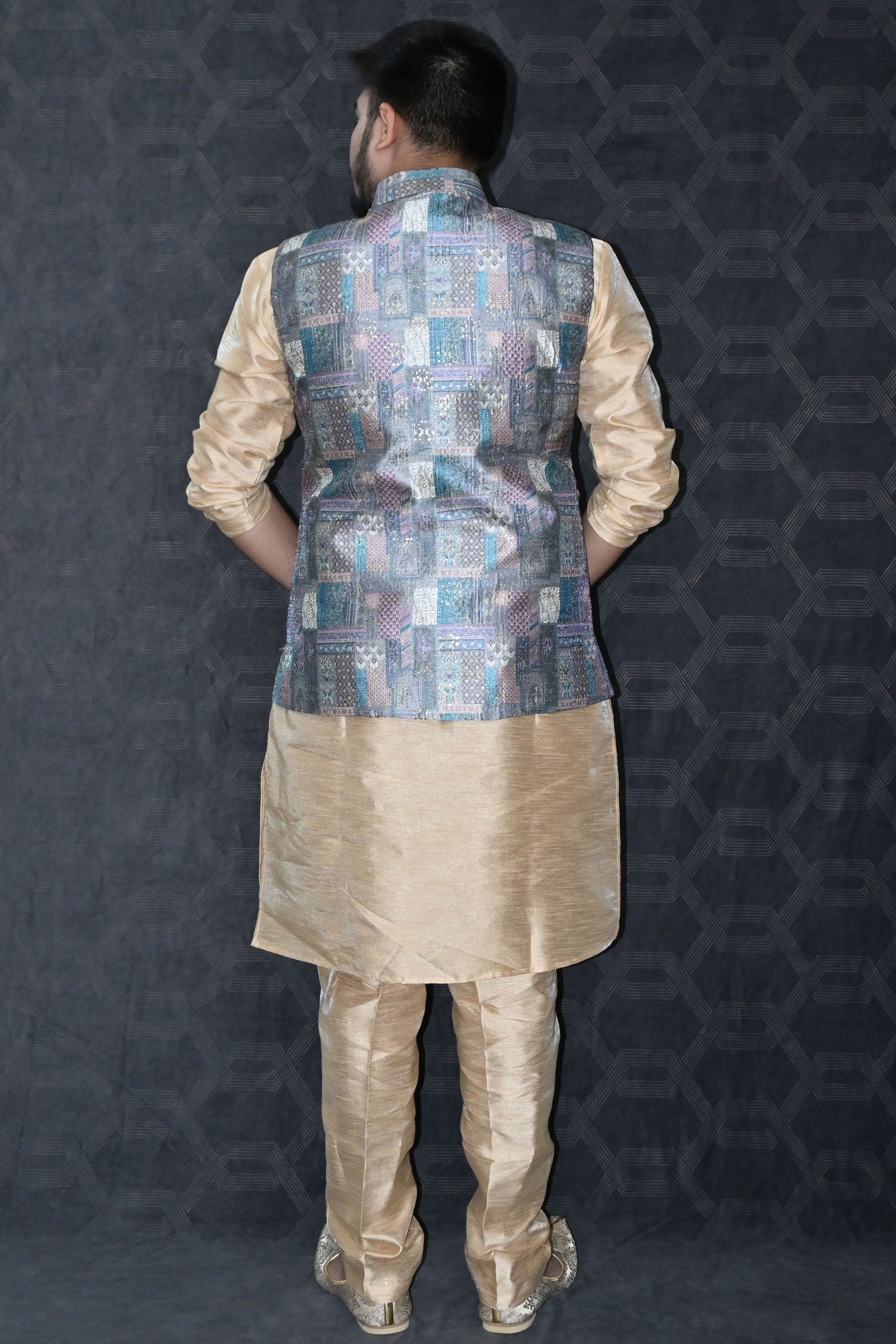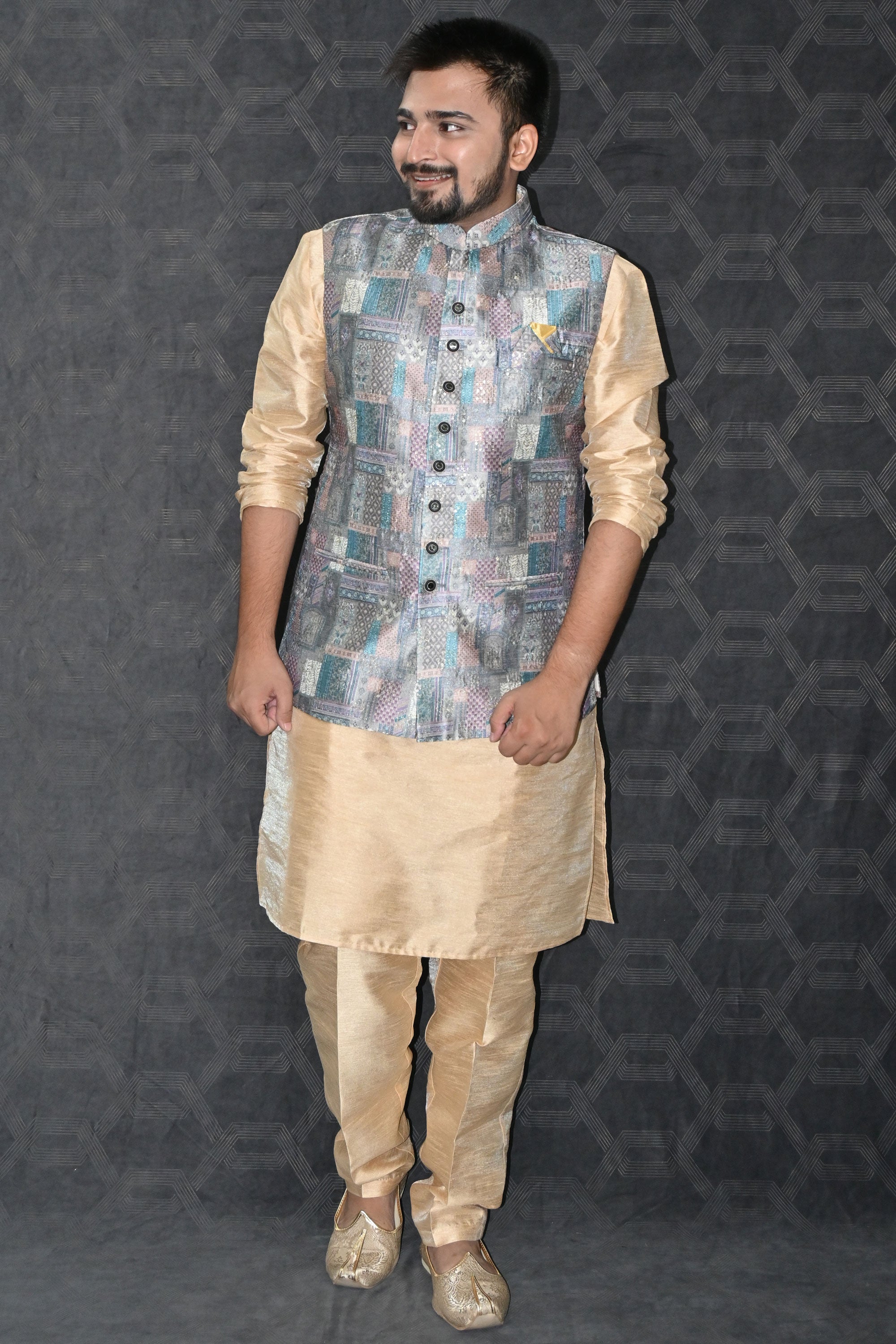 Deck yourself up in style for any grand occasion with our Art Silk Kurta Pyjama set for men. Rendered in a gleaming gold shade, the ensemble creates an aura of majestic charm. To make the outfit even more glamorous, we've included a finely designed three-piece jacket set. Perfectly readymade for your convenience, this outfit redefines the classic blend of elegance and convenience.