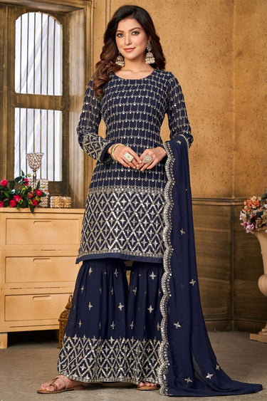 Gorgeous Georgette Navy Blue Color Sharara Suit with Shimmering Sequins Work