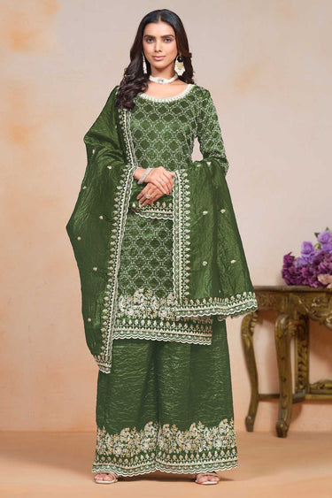 Elevate your style with this exquisite Palazzo Suit made from luxurious Gold Crush Fancy Fabric. The opulent top, with a length of up to 40 inches, features intricate embroidery that adds a touch of sophistication to your ensemble. The matching bottom and dupatta, also crafted from Gold Crush fabric, create a seamless, shimmering look perfect for special occasions. The inner lining made from comfortable Santoon ensures a smooth and flattering fit, while the rich gold tones make this outfit a stunning choice for evening events and festive gatherings. Slight color variations may occur due to lighting conditions, adding a unique charm to each piece. Step into the spotlight with elegance and shine in this dazzling Palazzo Suit!
