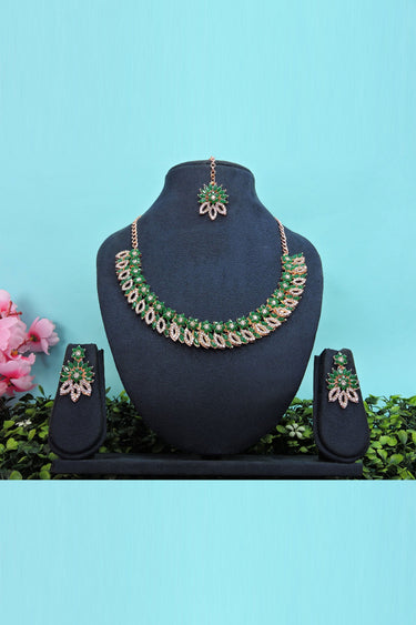 Green Color Alloy Material Beatific Necklace Set Earrings And Mang Tikka For Women