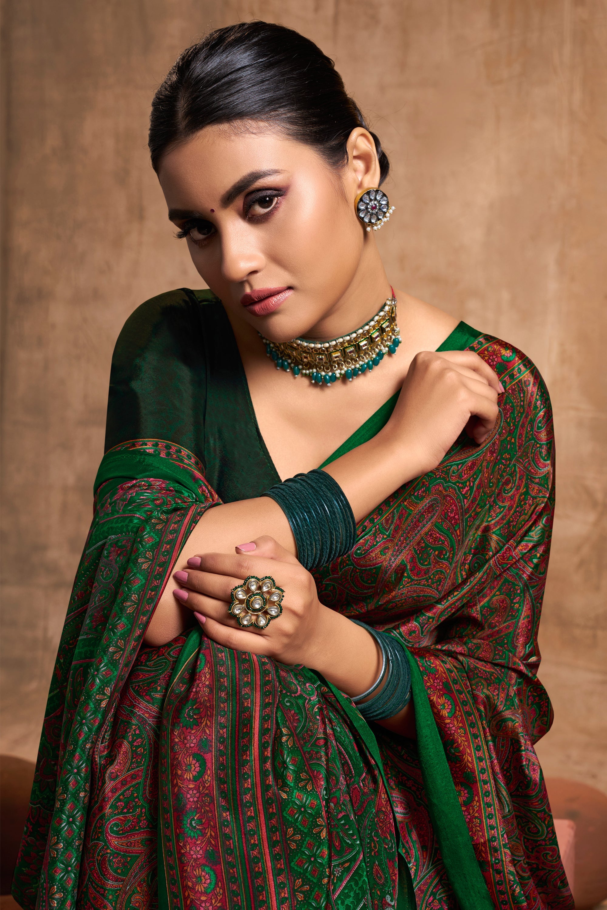 Green Color Daily Wear Classic Printed Crepe Silk Fabric Saree