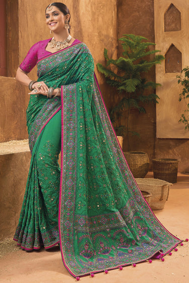 Green Color Fascinating Kachhi Work Banarasi Silk Saree