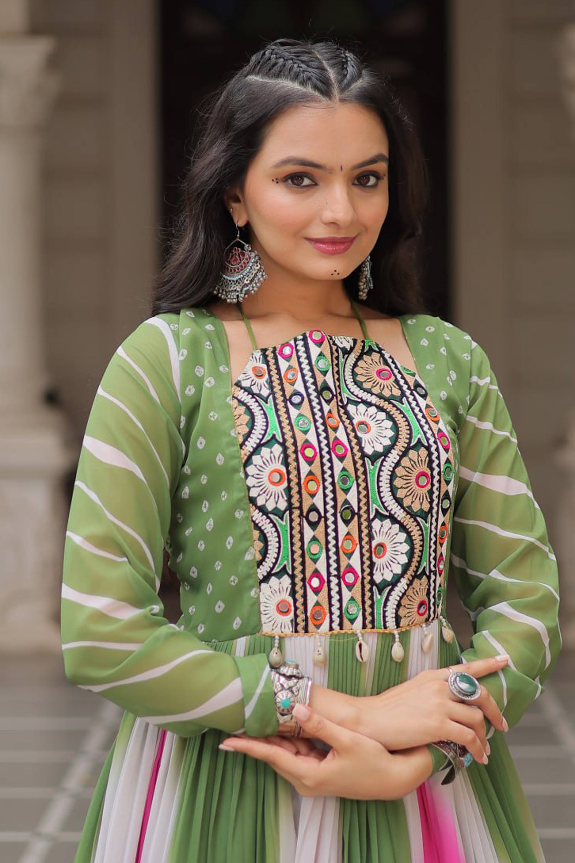 Green Faux Georgette Laheriya Bandhej Print Navratri Special Gown