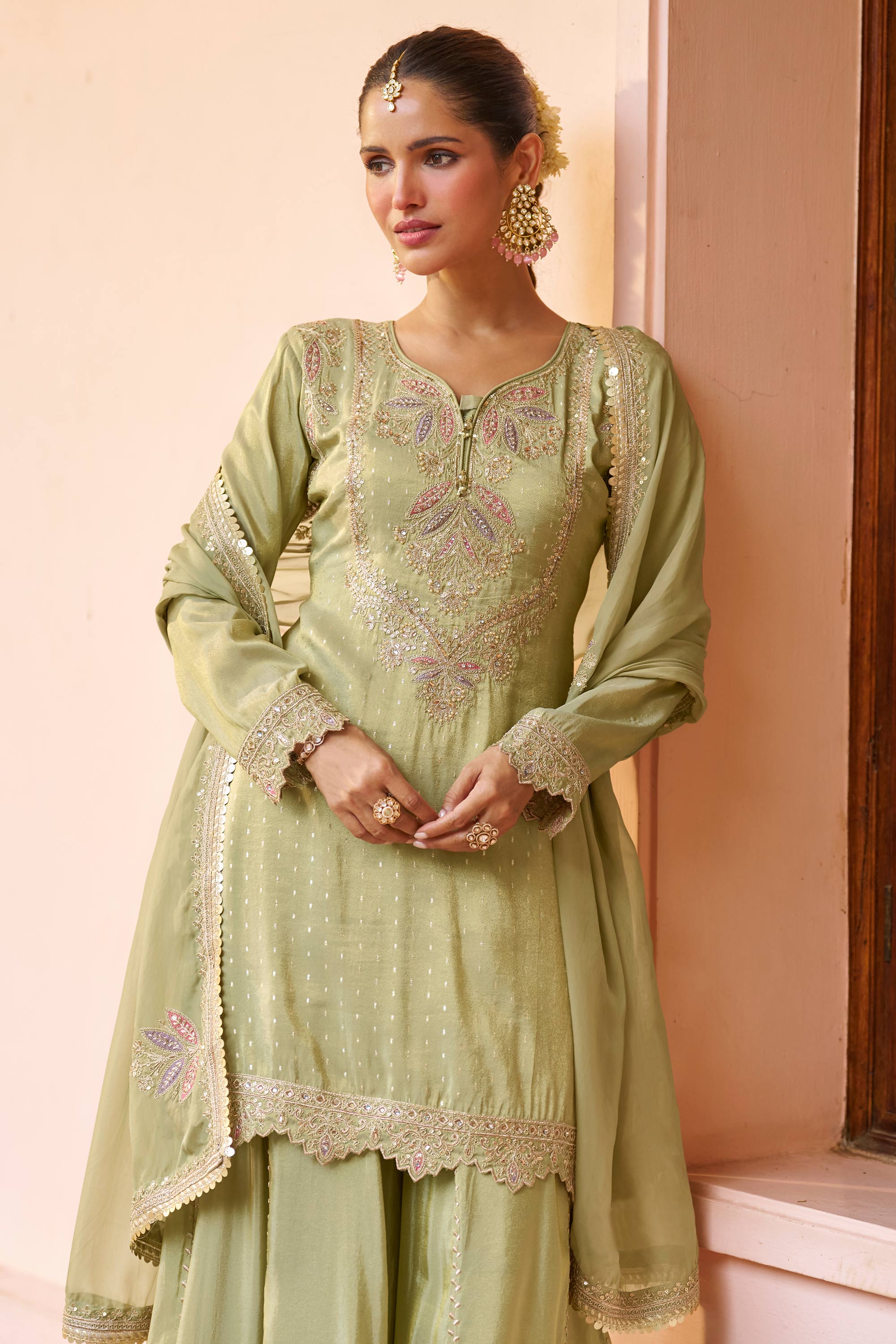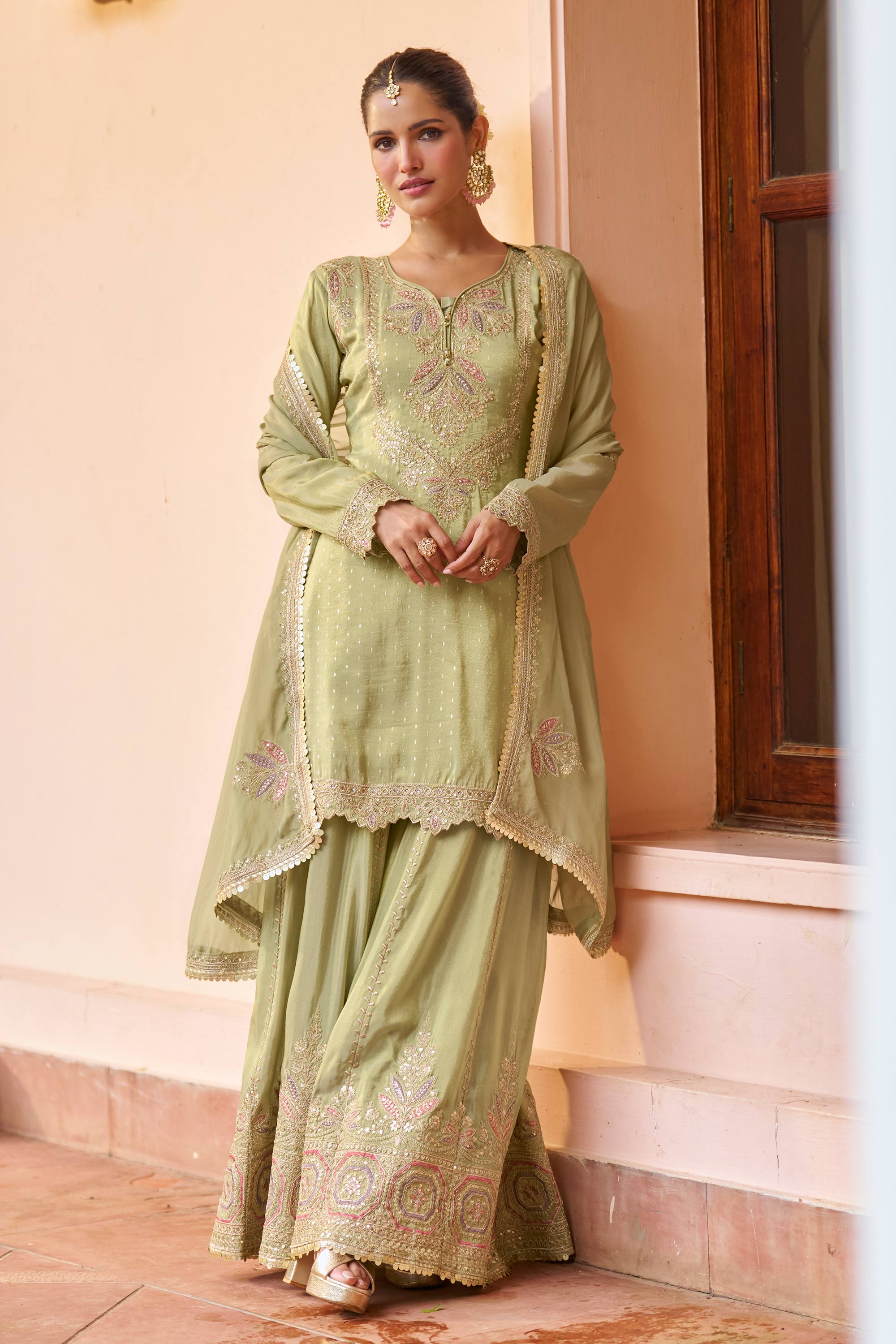 Green Function Wear Chinon Embroidered Readymade Palazzo Suit With Dupatta