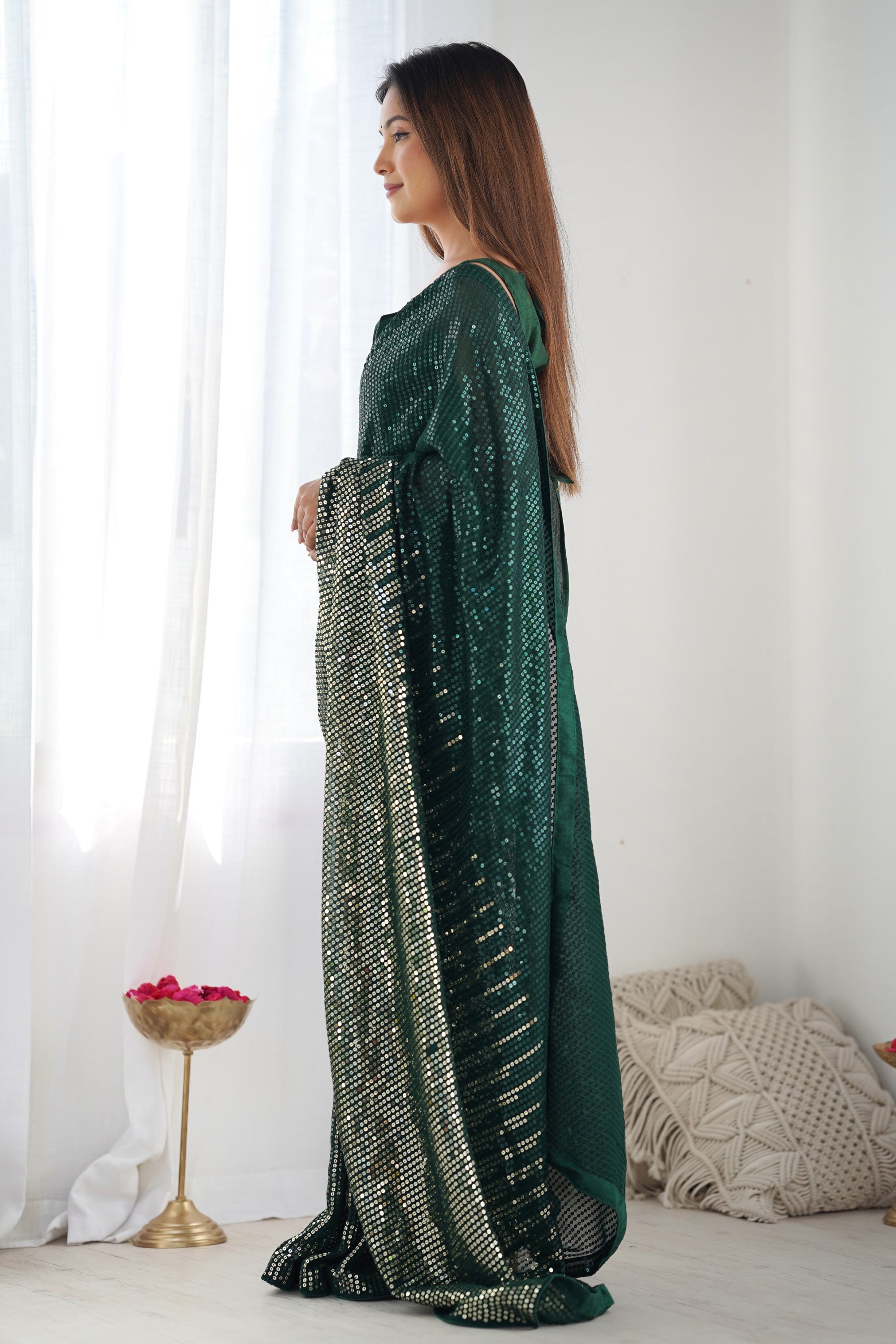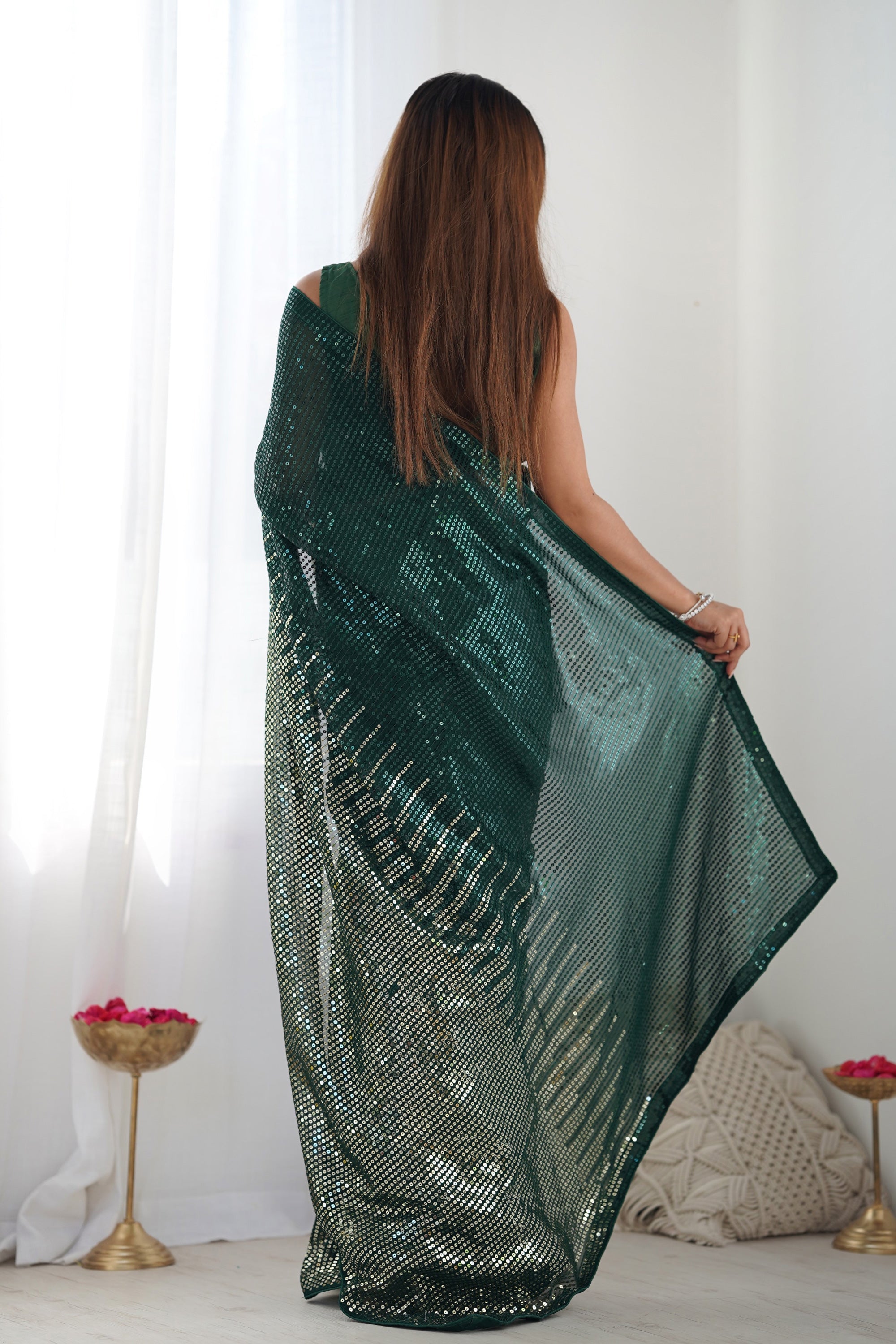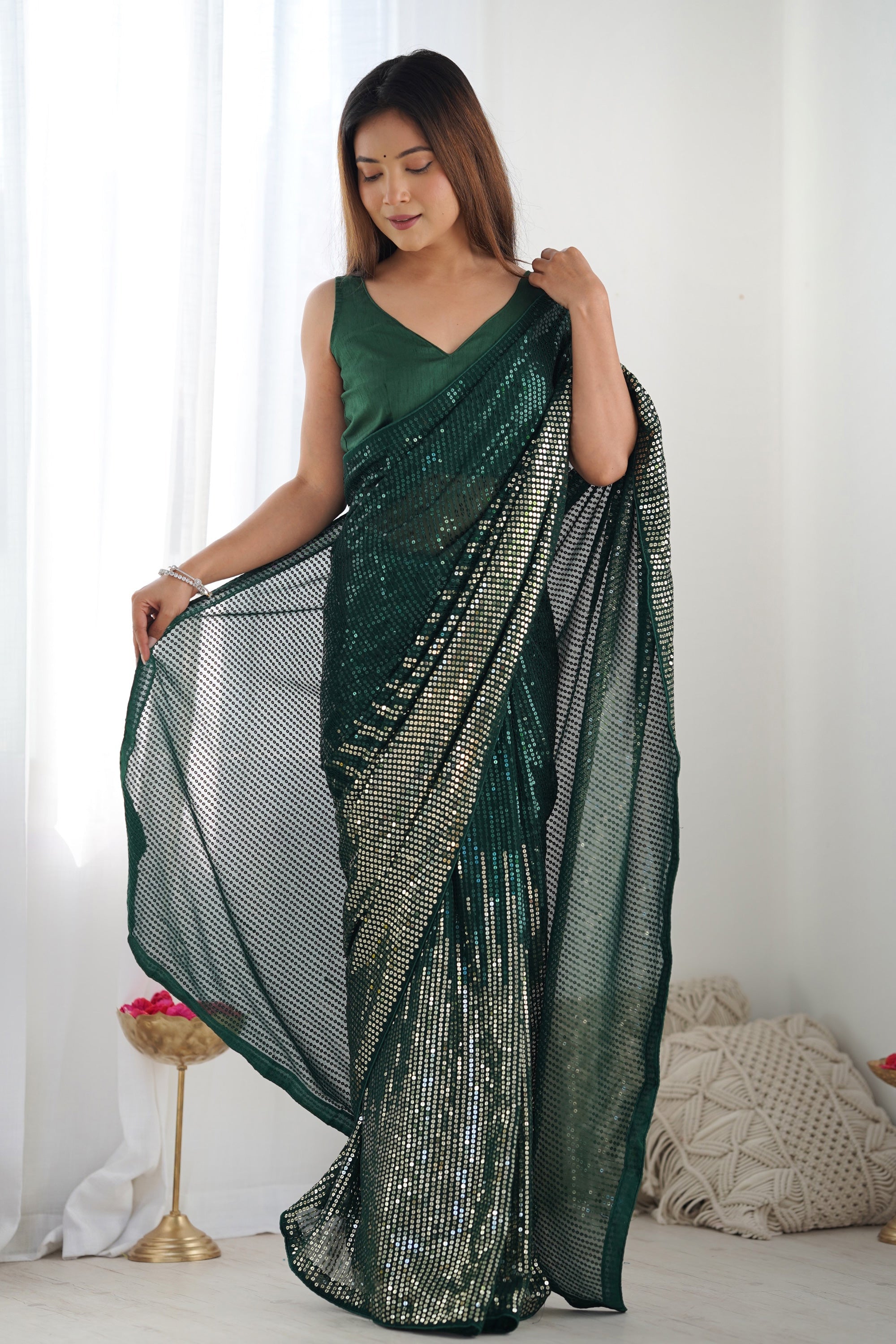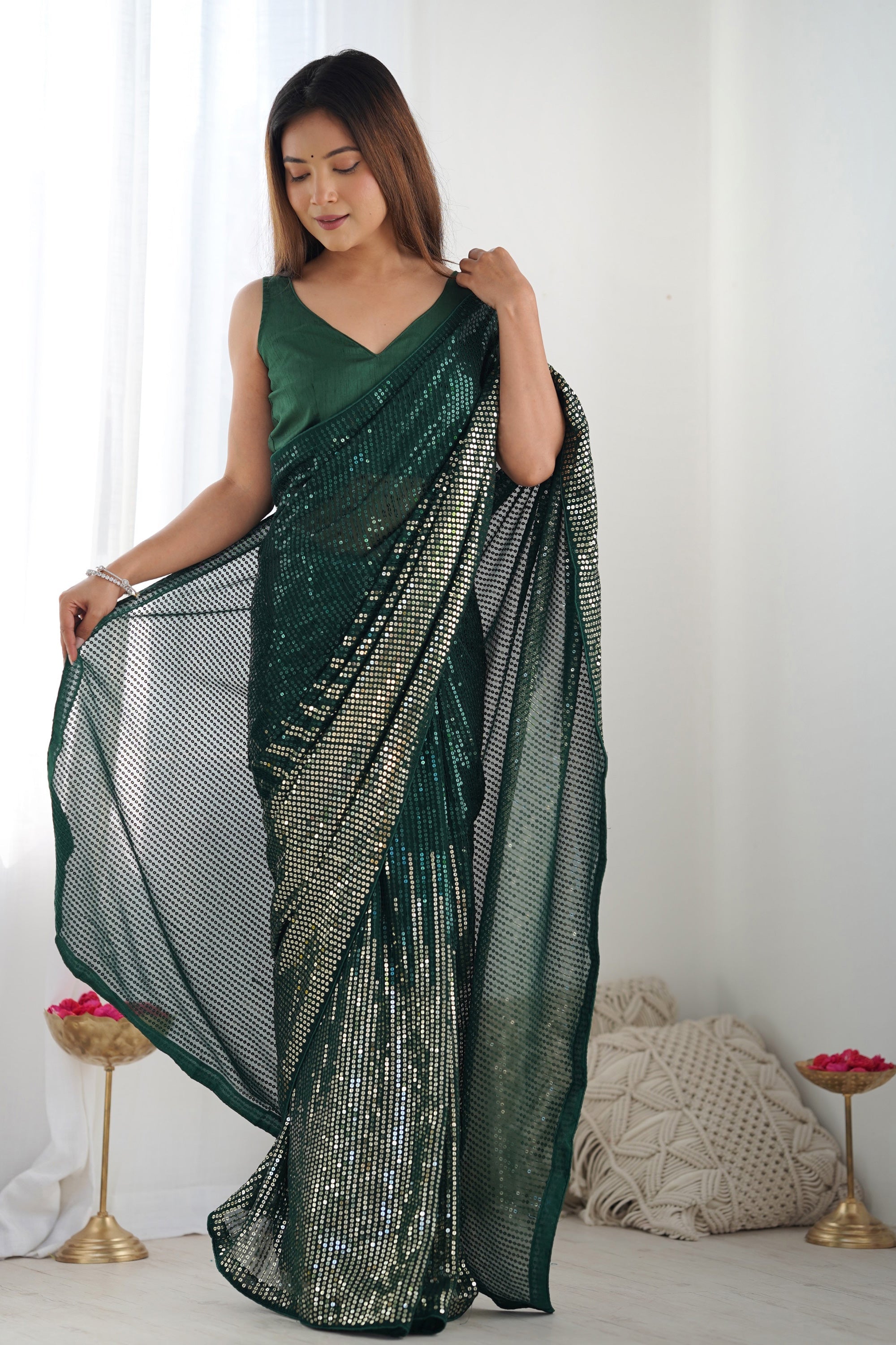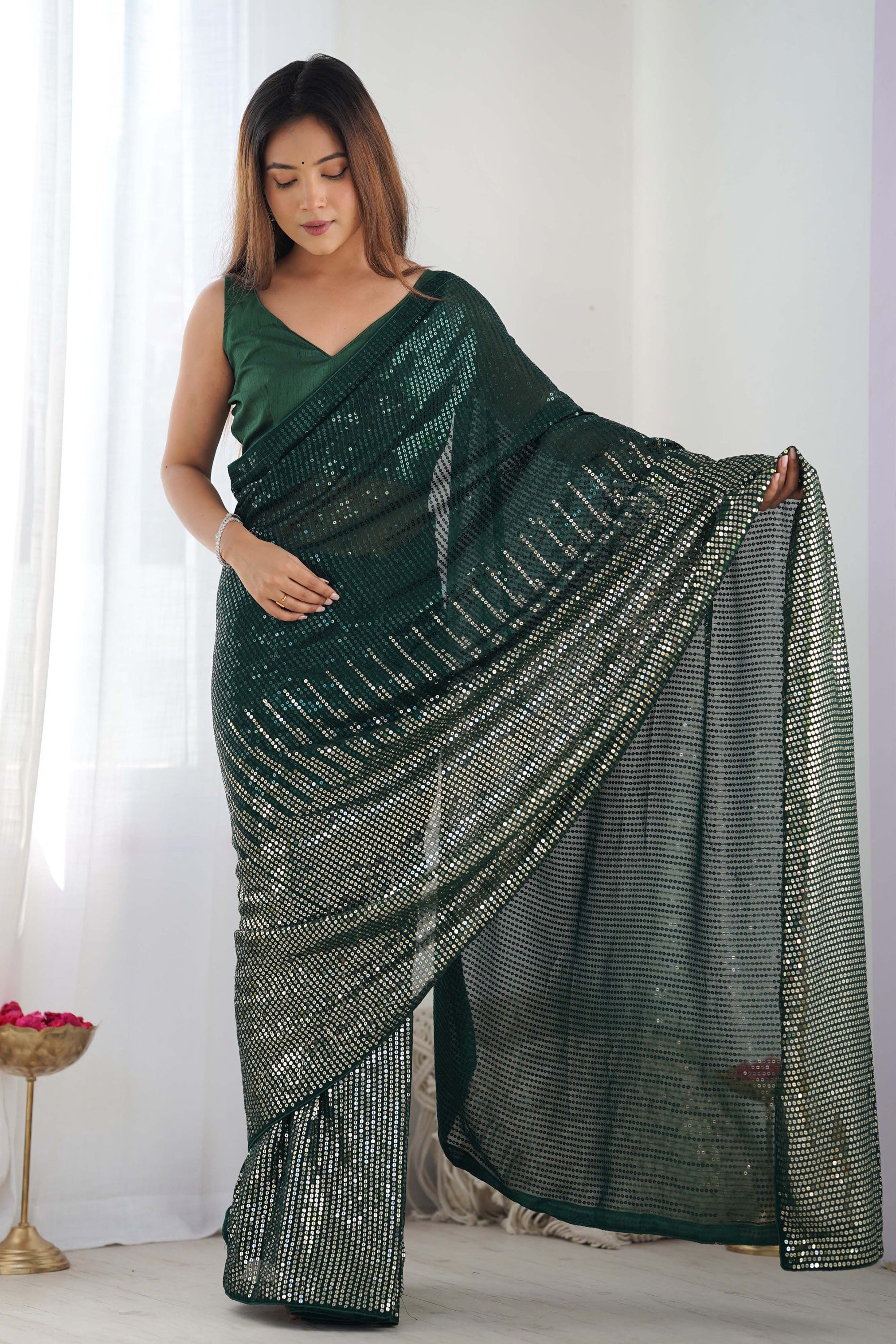 Elevate your party look with our gorgeous Georgette Saree adorned with intricate sequins work. This traditional yet stylish piece comes with a matching fancy blouse to complete the look. Perfect for weddings, festivals, and special events. The lightweight georgette fabric ensures a comfortable fit, making it an ideal choice for long hours of wear. Available for quick shipping, this saree is perfect for those who love elegance and convenience.