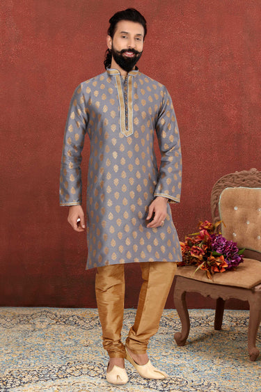 Grey Color Stunning Jacquard Silk Fabric Function Wear Kurta Pyjama For Men