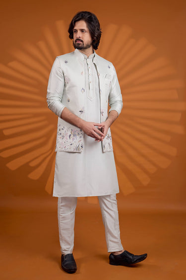 Grey Wedding Wear Art Silk Fabric Readymade Kurta And Aligadhi Pant With Embroidered Jacket For Men