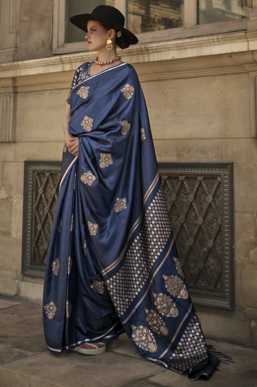 Handloom Zari Weaving Work Pure Satin Silk Fabric Sangeet Wear Navy Blue Color Designer Saree