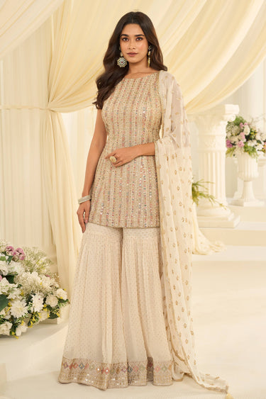 Heavy Embroidered Beige Readymade Sharara Style Salwar Suit
