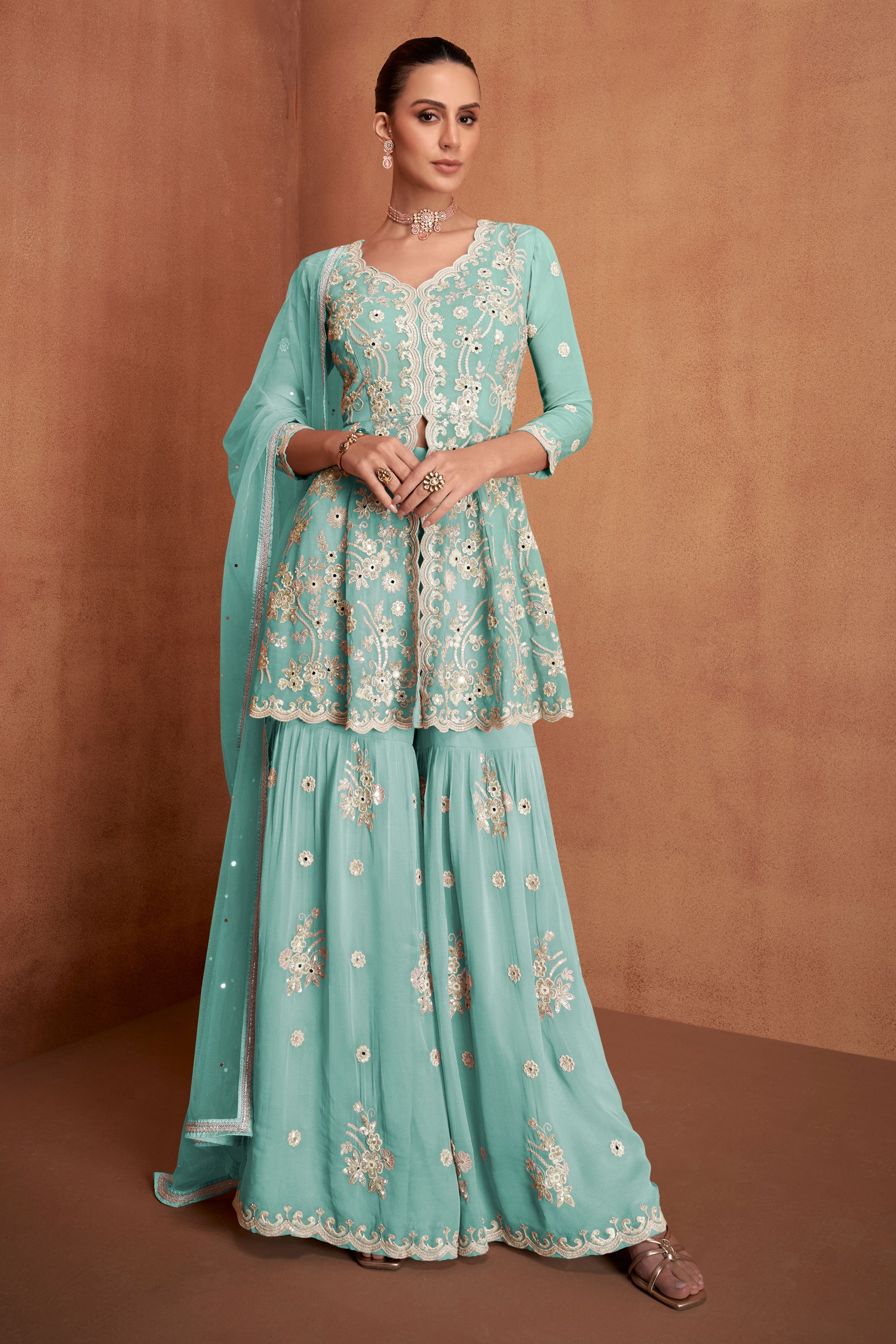 Heavy Embroidered Cyan Readymade Sharara Style Salwar Suit