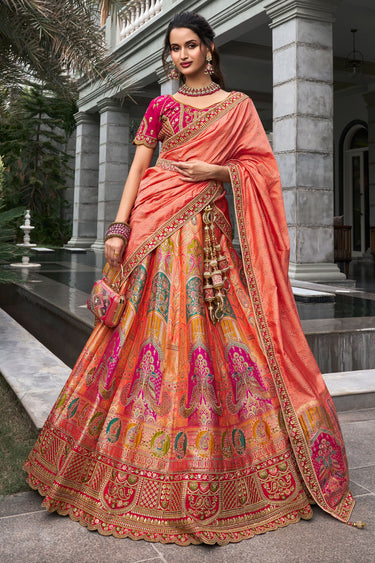 Heavy Embroidered Orange Color Bridal Lehenga Choli In Banarasi Silk Fabric