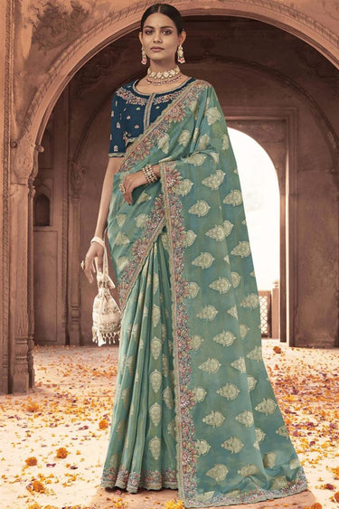 Incredible Embroidered Work On Sea Green Color Tissue Silk Saree