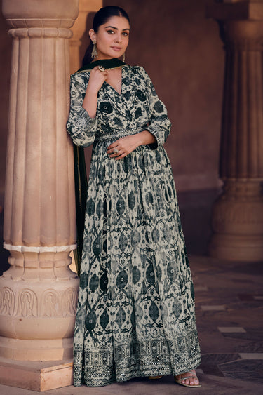 Step into elegance with this stunning readymade gown with dupatta. Crafted from luxurious Georgette fabric, this gown features intricate printed work that adds a touch of glamour to your party look. The flowing silhouette and flattering fit make it perfect for any special occasion.