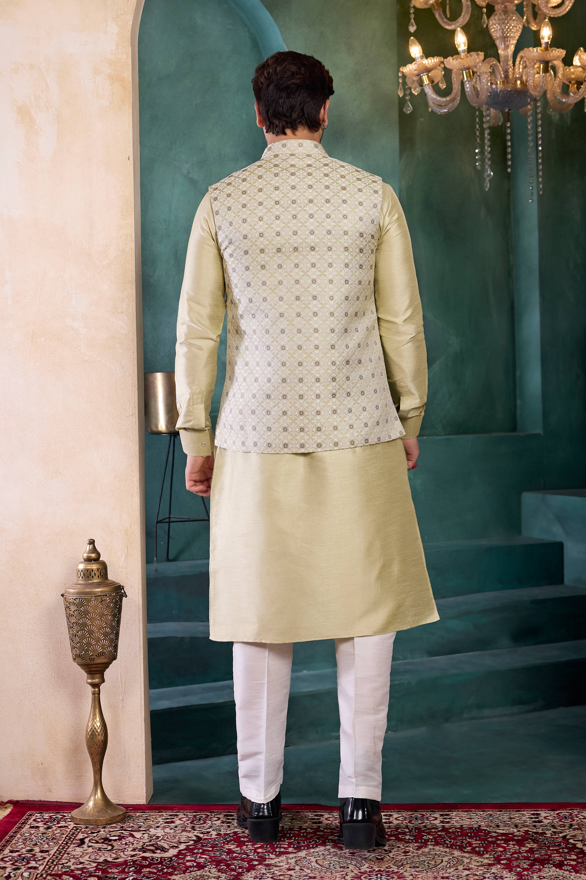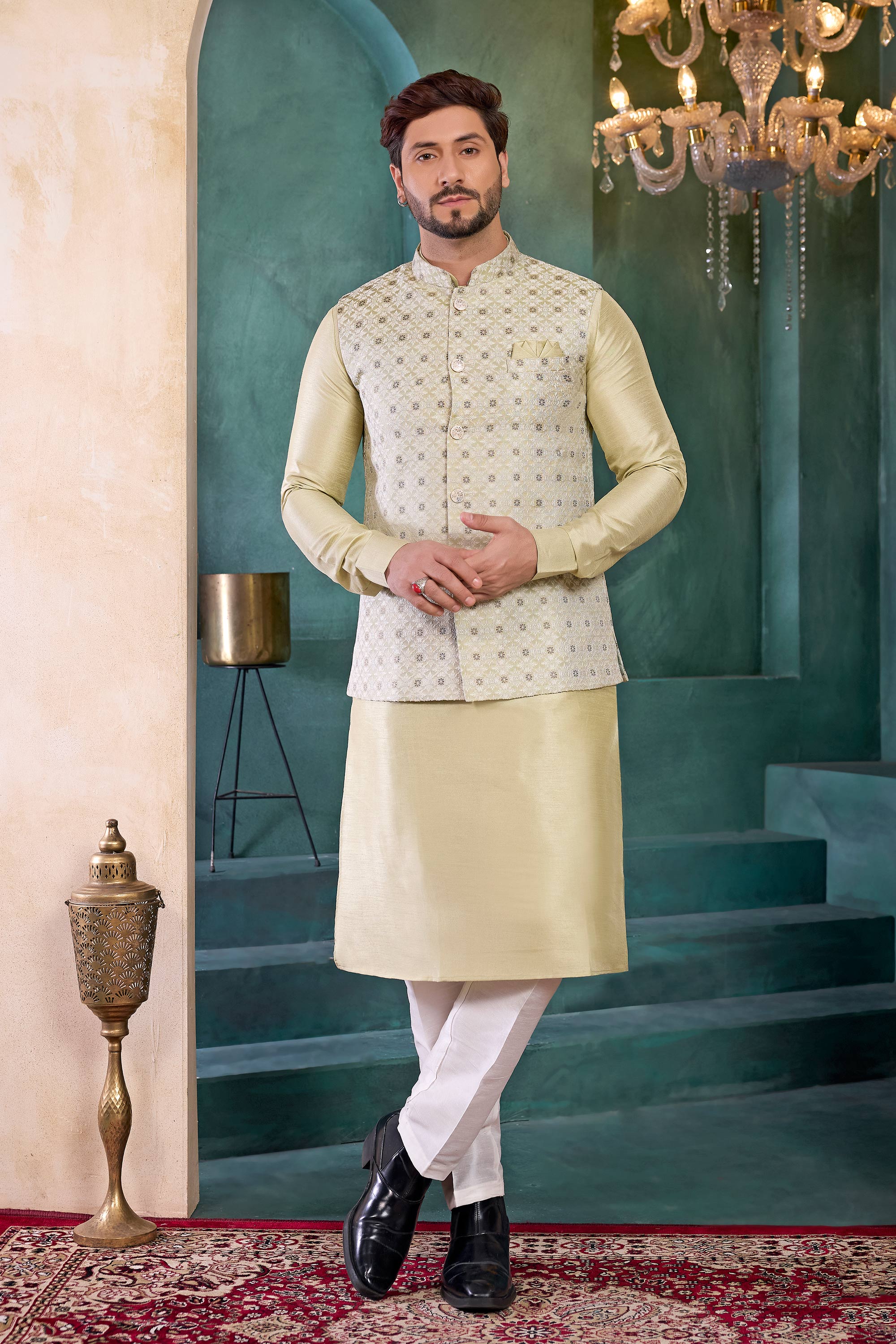 Enhance your traditional wardrobe with this premium mens 3-piece kurta set, perfect for wedding functions and festive occasions. The set features a readymade kurta, a stylish jacket, and comfortable Aligadhi pants, designed for sophistication and ease of wear. The designer details bring a refined touch to every gathering, ensuring you look sharp and elegant. Available in vibrant color options to complement any celebration, this outfit blends modern charm with cultural heritage. The high-quality fabric guarantees comfort and durability, keeping you at ease all day long. Whether it's a family gathering or a grand celebration, this ensemble will have you turning heads.