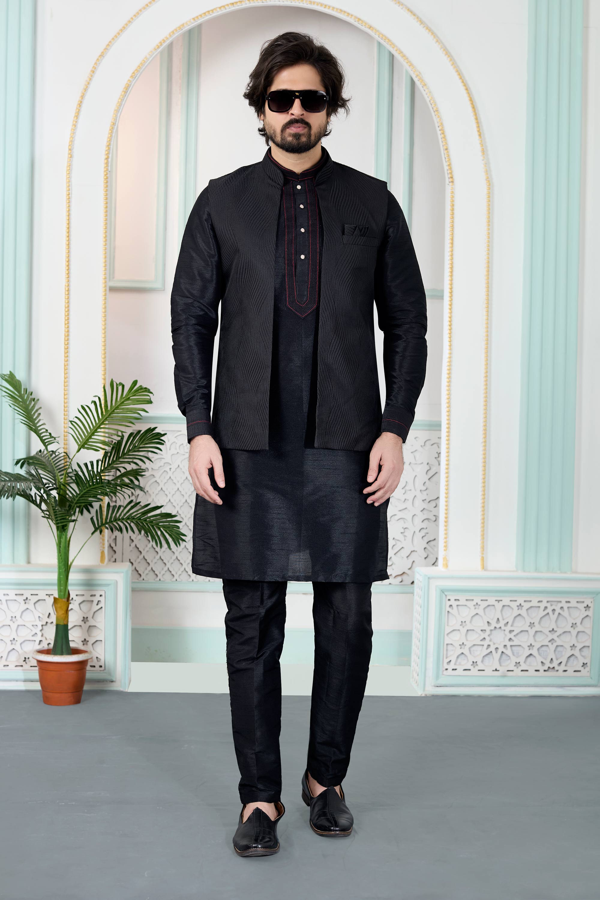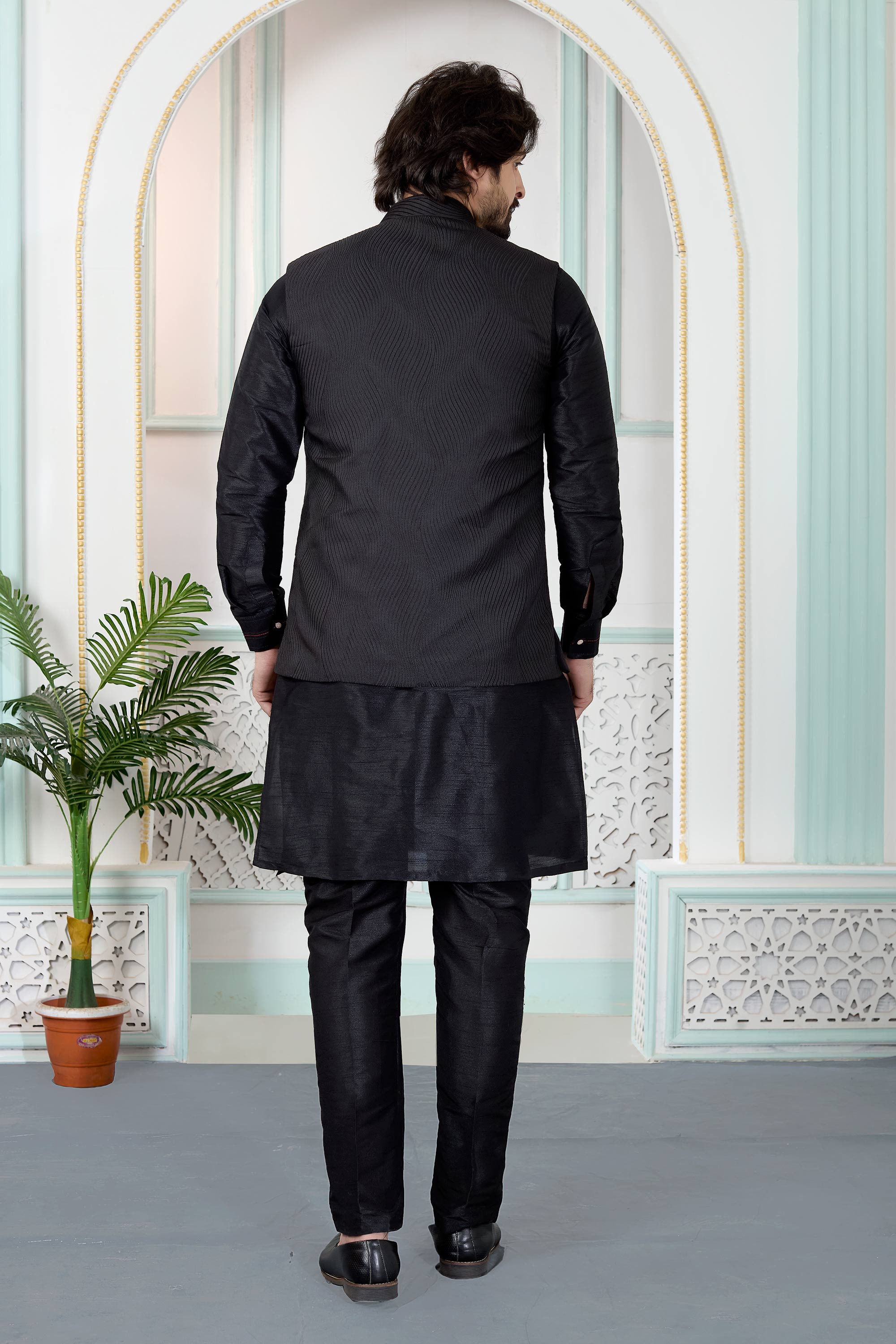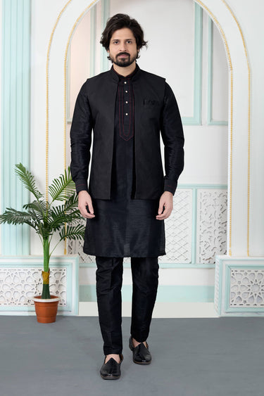 Jacquard Fabric Black Men Readymade Kurta And Aligadhi Pant With Jacket For Men