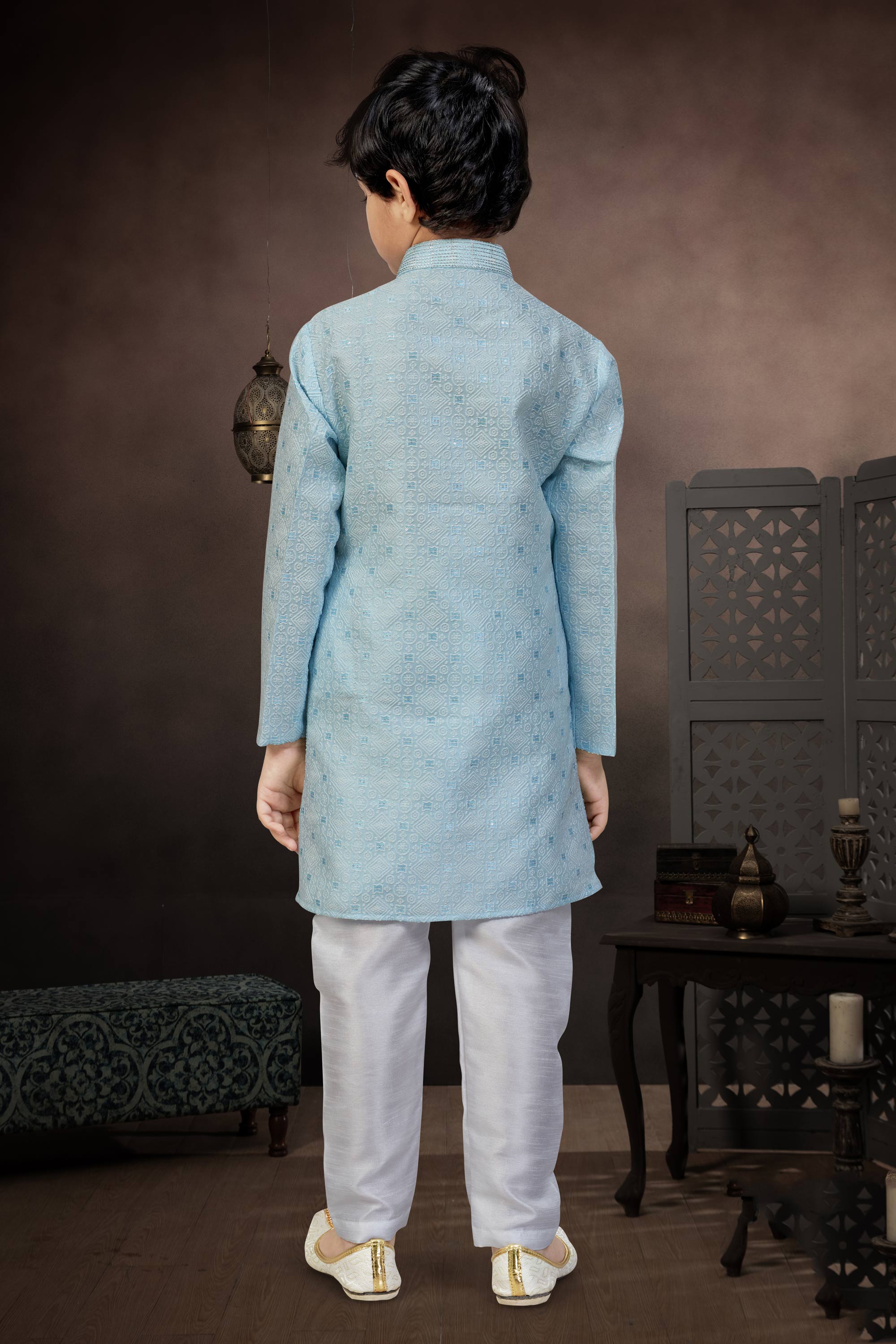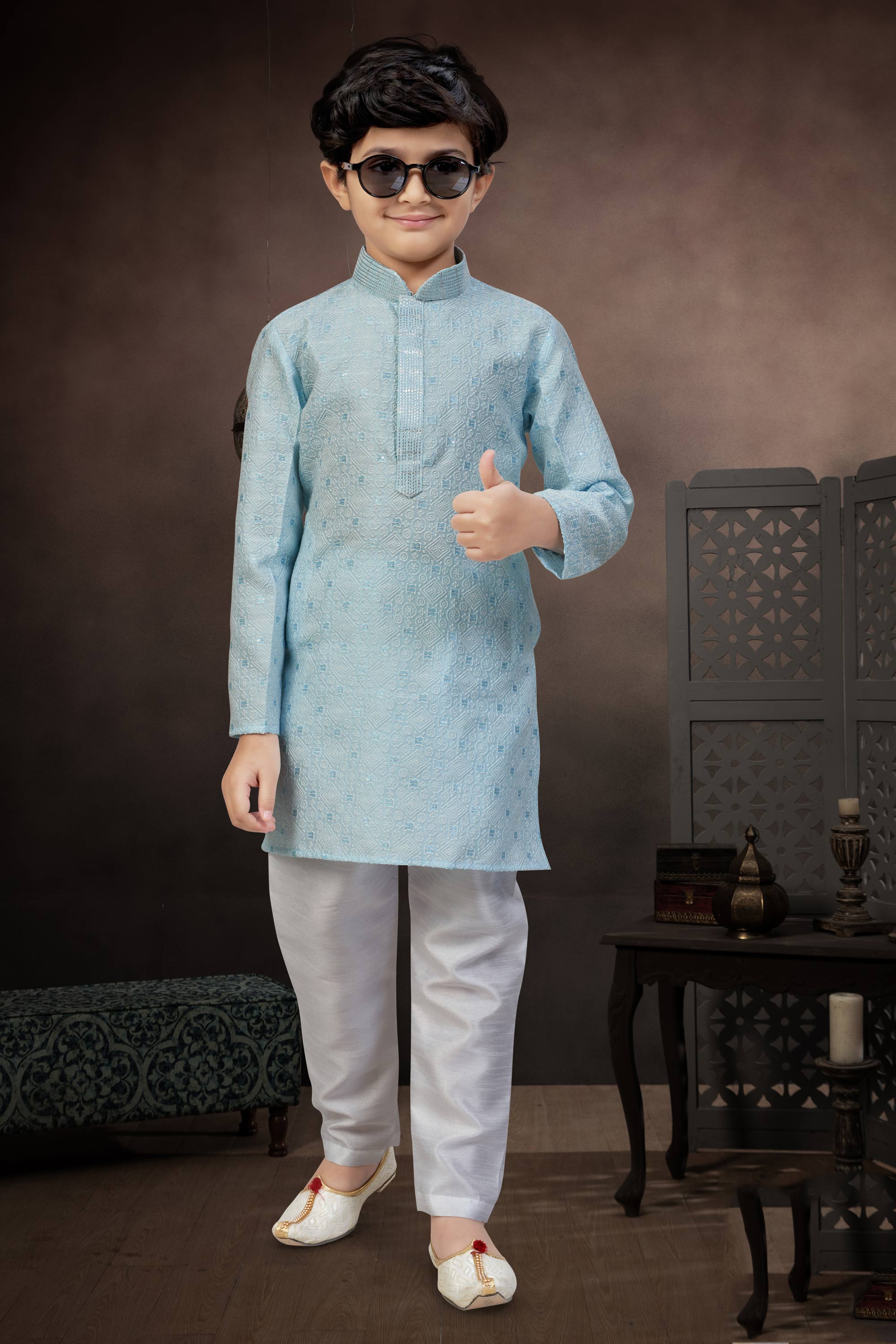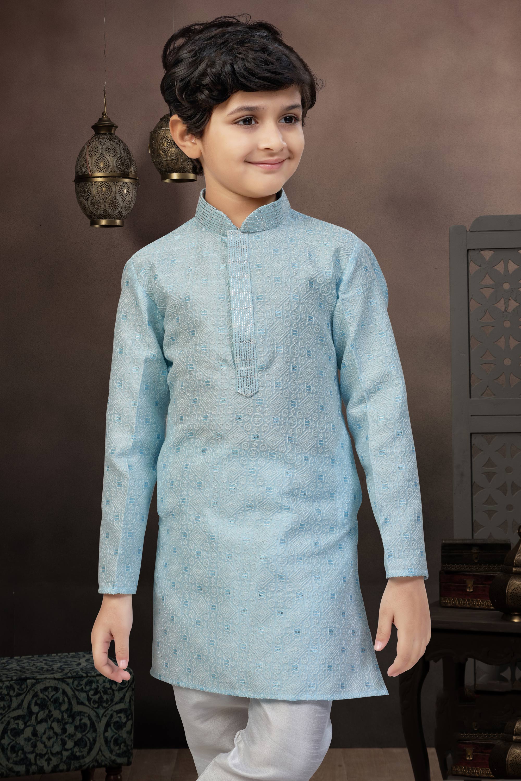 Jacquard Fabric Cyan Sangeet Wear Readymade Kurta Pyjama For Boys