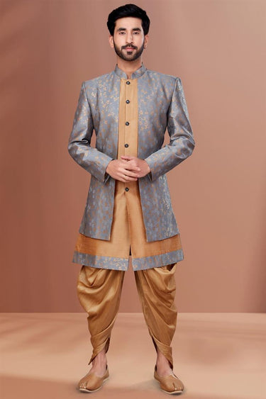 Jacquard Fabric Grey Wedding Wear Readymade Lovely Dhoti Style Indo Western For Men