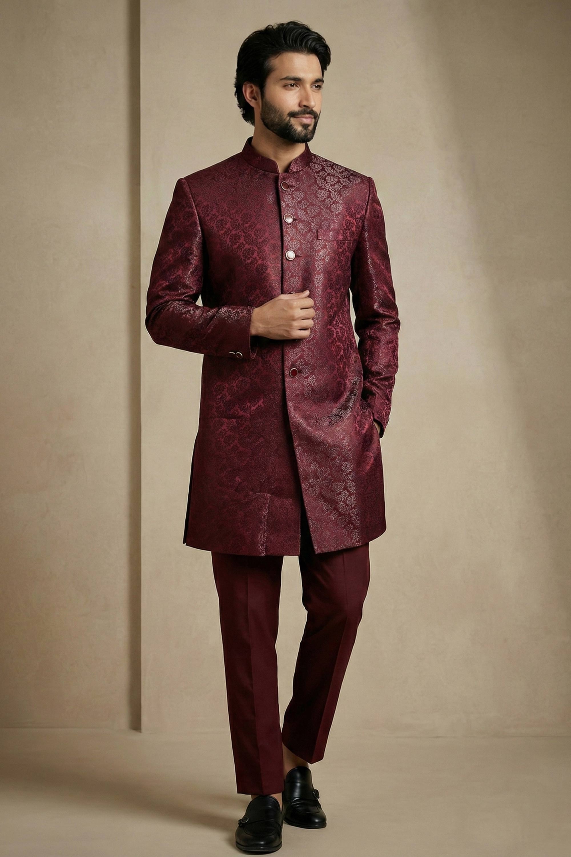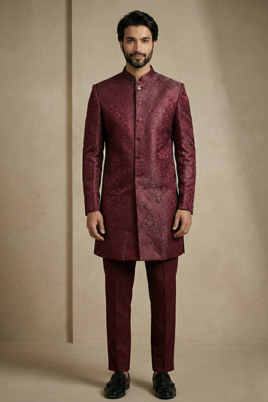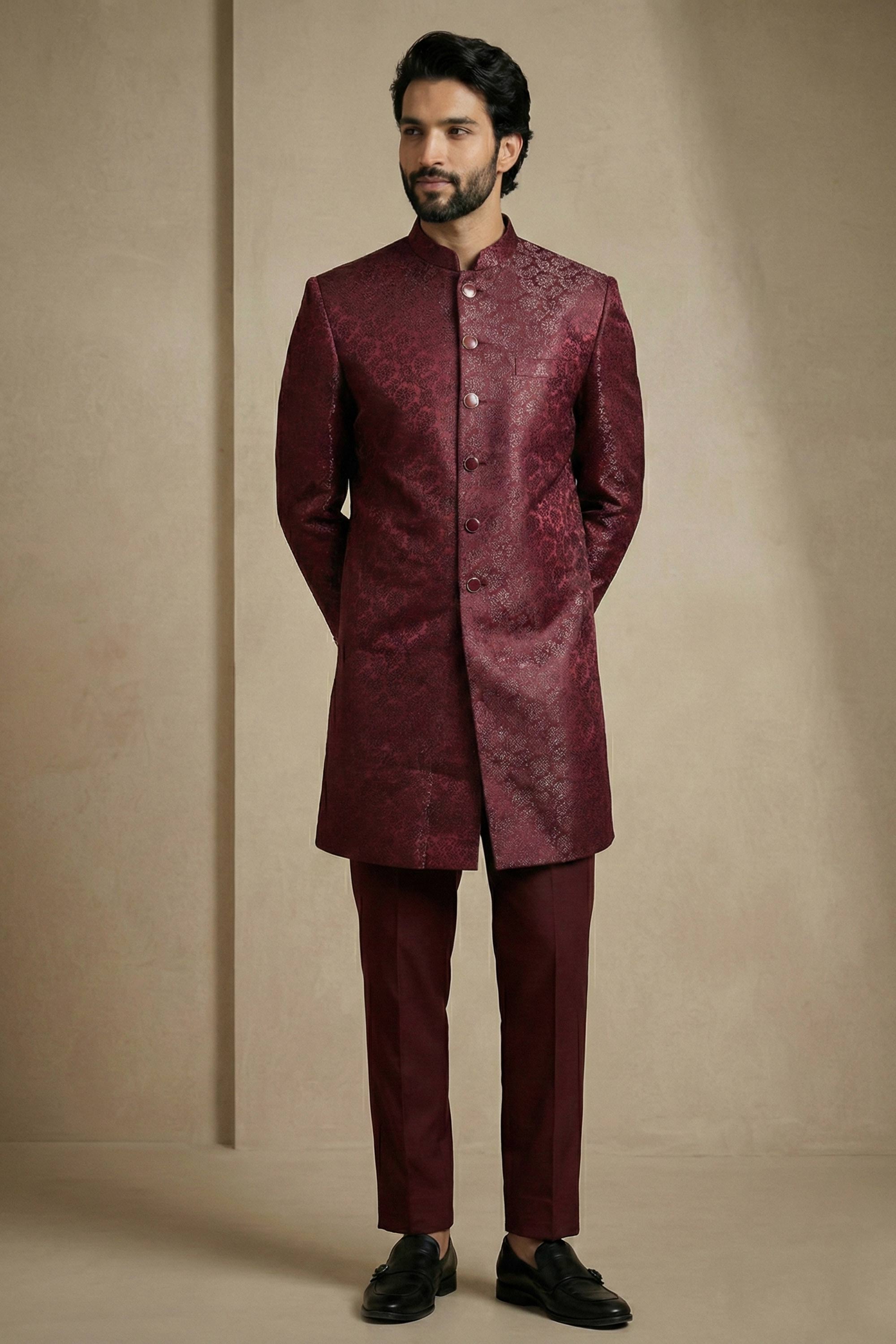 Jacquard Fabric Maroon Sangeet Wear Readymade Indo Western For Men