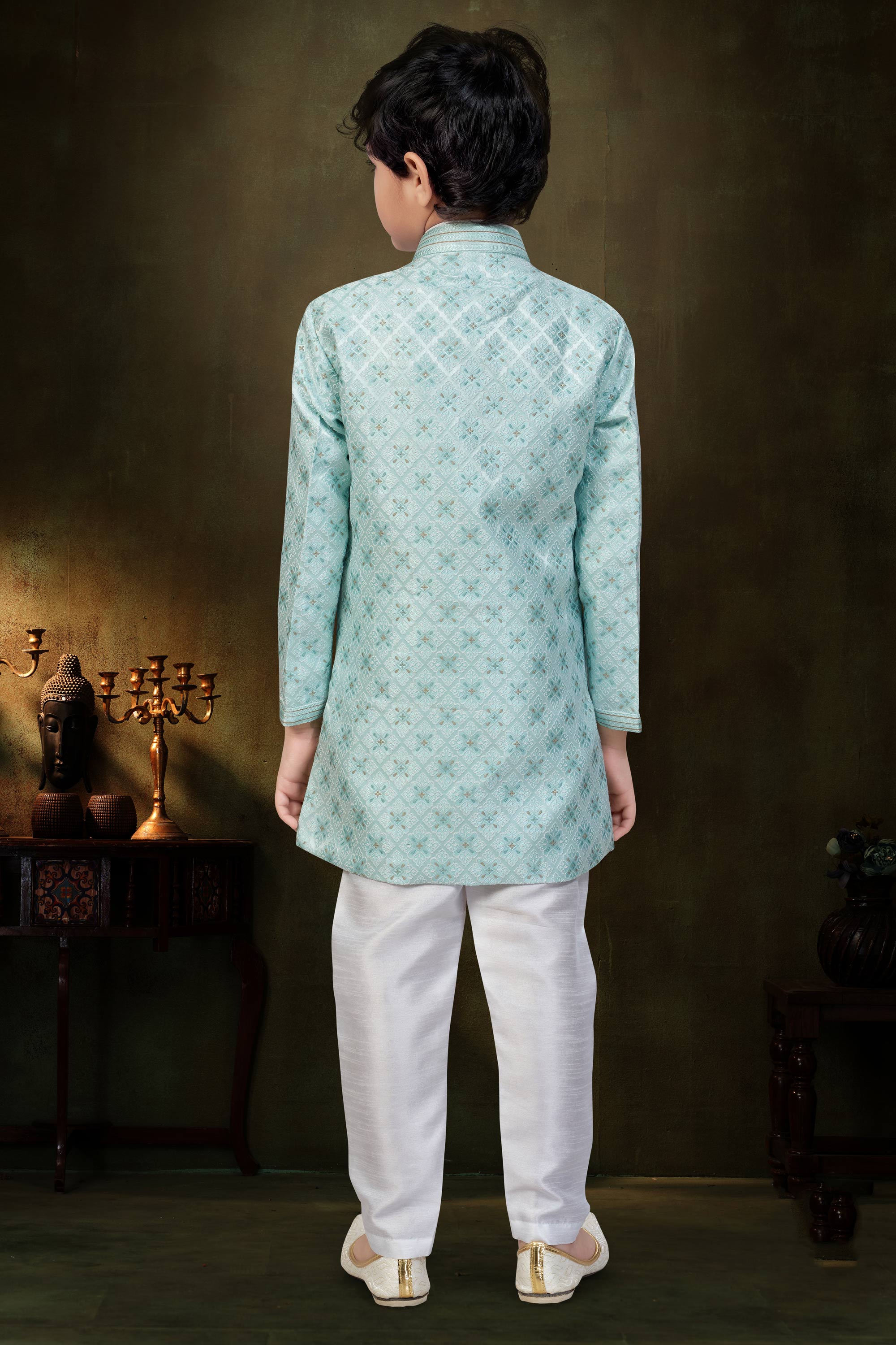 Give your little prince a royal festive look with this stylish Boys Indo Western Readymade Outfit, designed to blend traditional charm with a modern silhouette. Crafted from premium Jacquard fabric, the Indo Western top offers a rich texture and graceful appeal, making it perfect for festivals and special occasions. Due to digital photography, slight color variations may occur.