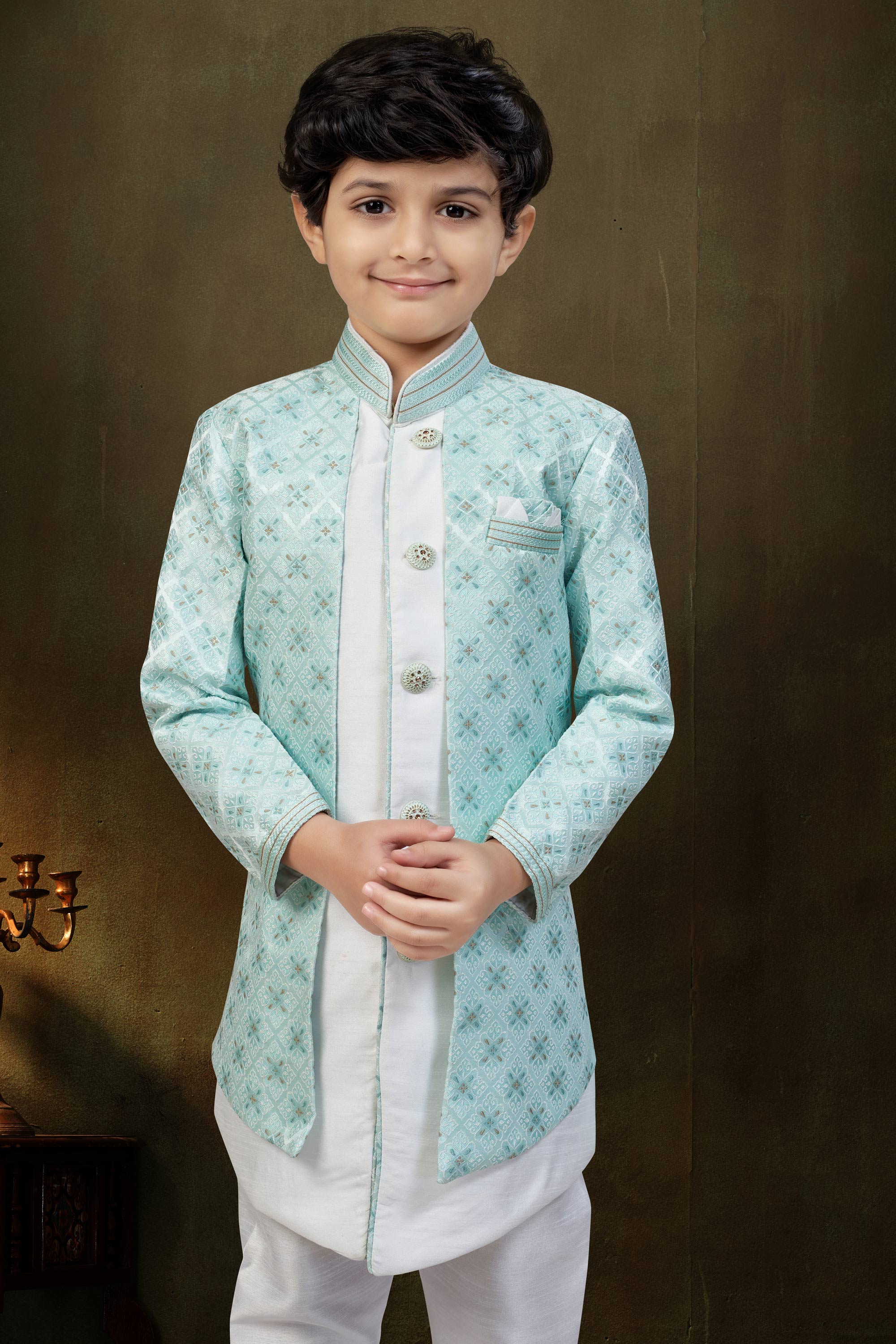 Jacquard Fabric Off White Festive Wear Readymade Indo Western For Boys