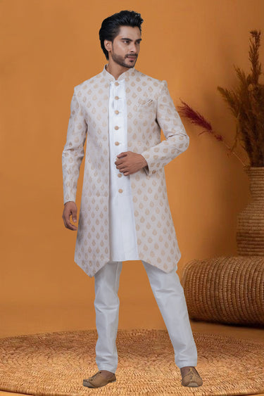 Jacquard Work Sangeet Wear Readymade Indo Western For Men In Jacquard Silk Cream Color