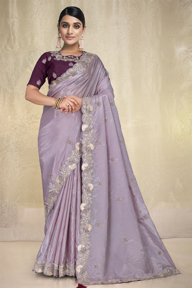 Lavender Color Engaging Embroidered Work Crepe Fabric Saree