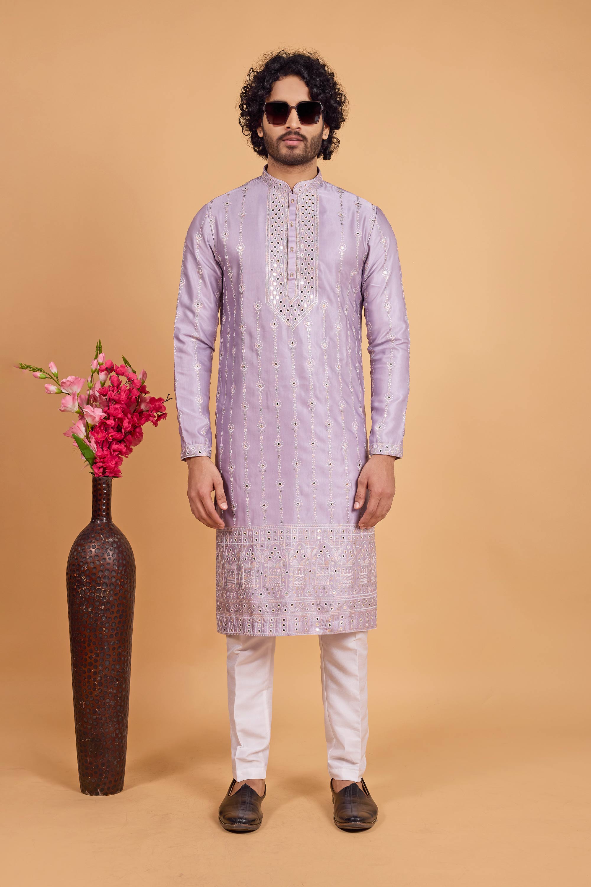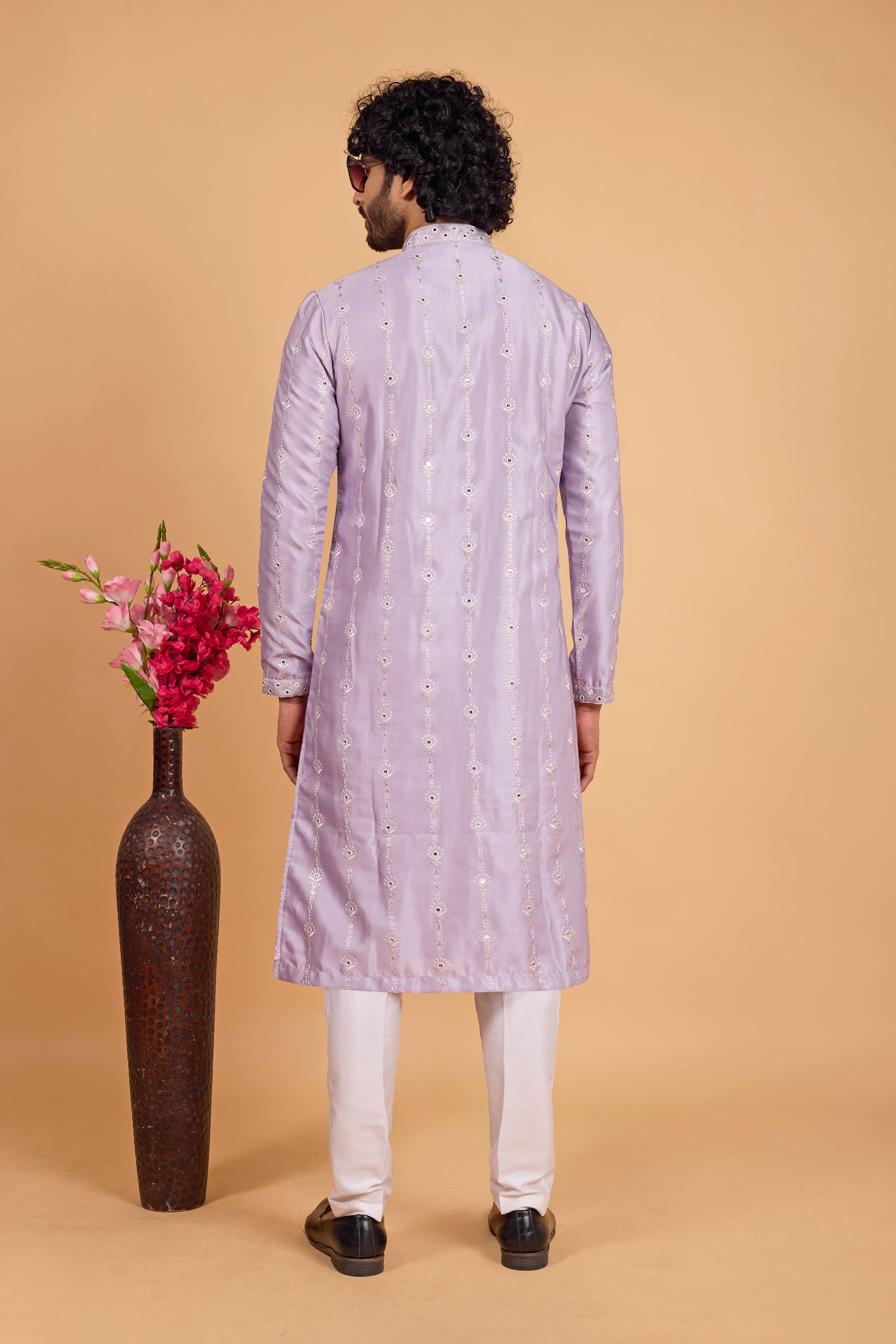 Lavender Festive Wear Art Silk Embroidered Kurta Pyjama For Men