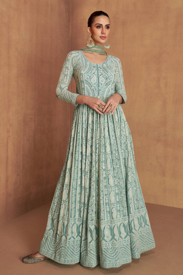 Light Cyan Party Wear Georgette Readymade Anarkali Style Gown With Dupatta
