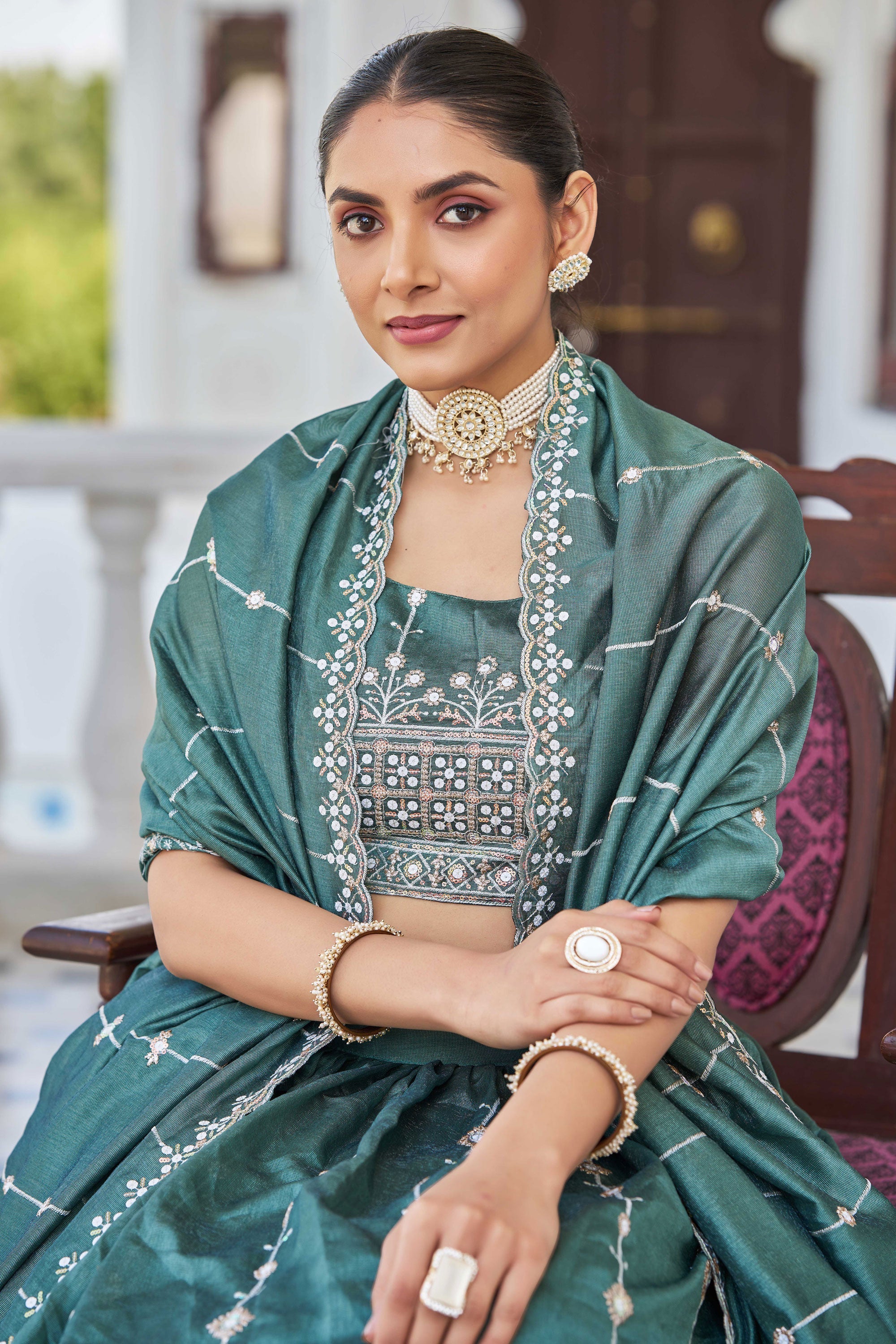 Light Cyan Sangeet Wear Designer Embroidered Art Silk Lehenga Choli