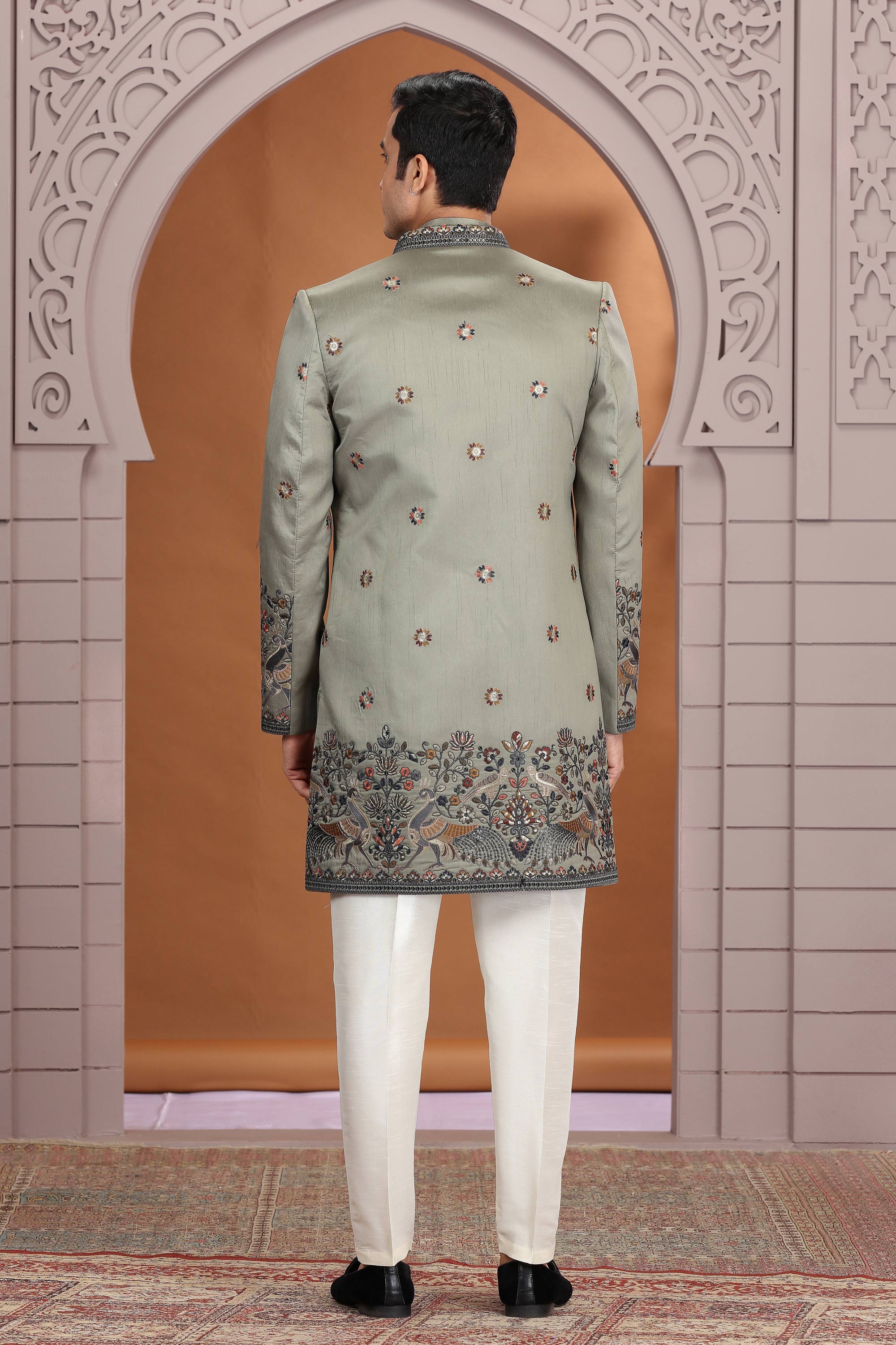 Light Olive Green Embroidered Readymade 3 Piece Indo Western For Men