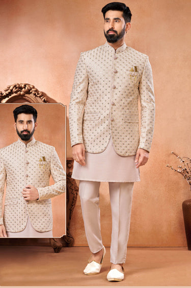 Light Pink Embroidery Work Gorgeous Banarasi Silk Fabric Wedding Wear Readymade Indo Western Jodhpuri Suit For Men