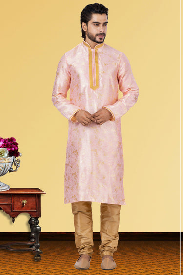 Linen Silk Fabric Readymade Kurta Pyjama For Men In Pink Color
