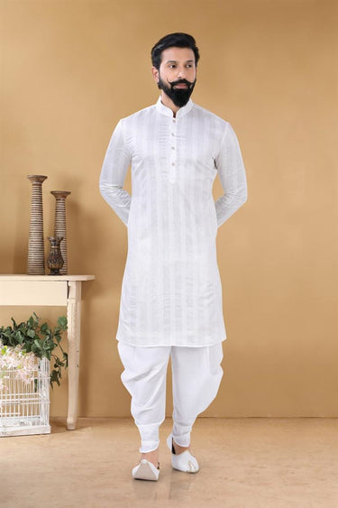 Lovely White Color Georgette Fabric Sangeet Wear Trendy Readymade Kurta With Dhoti For Men