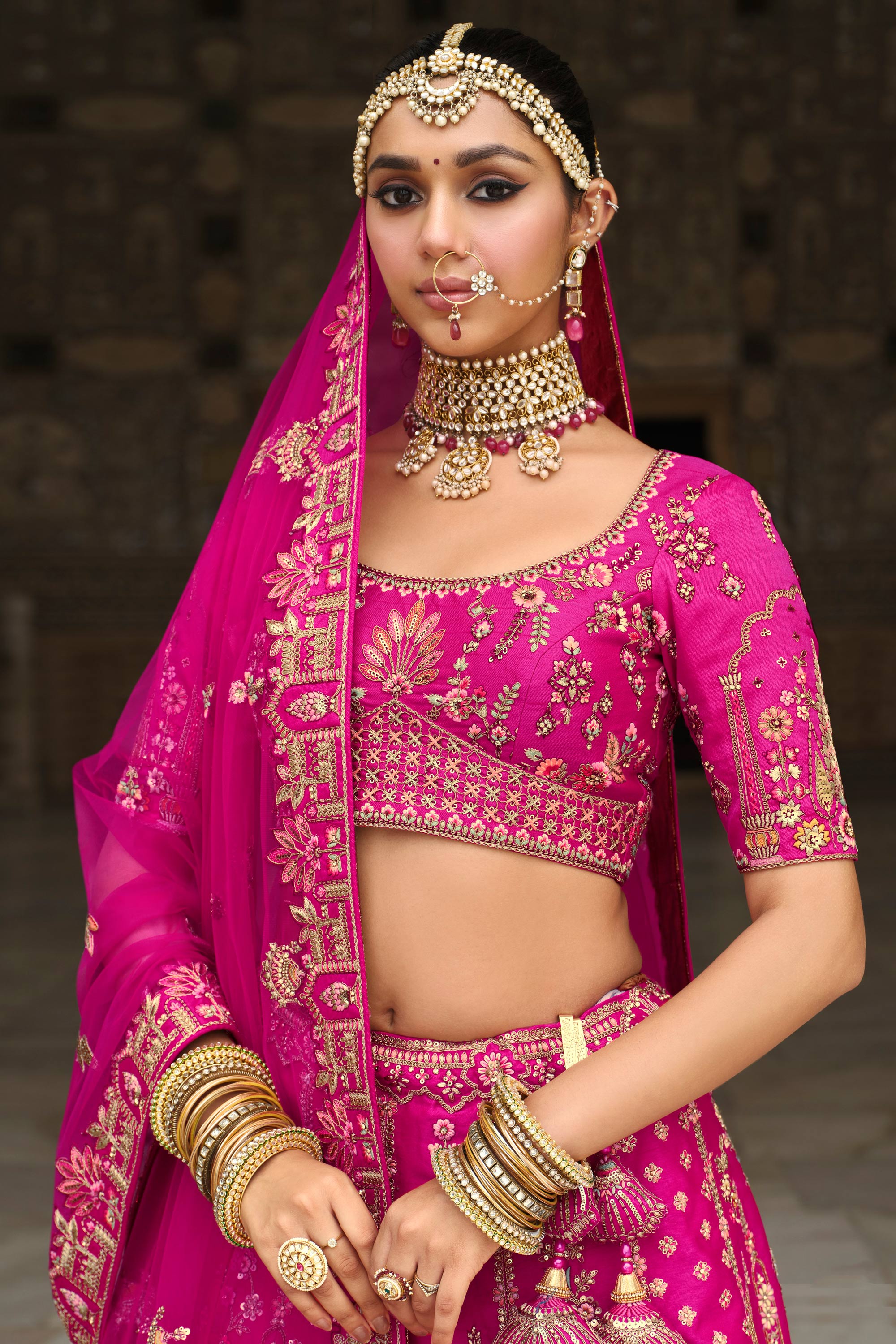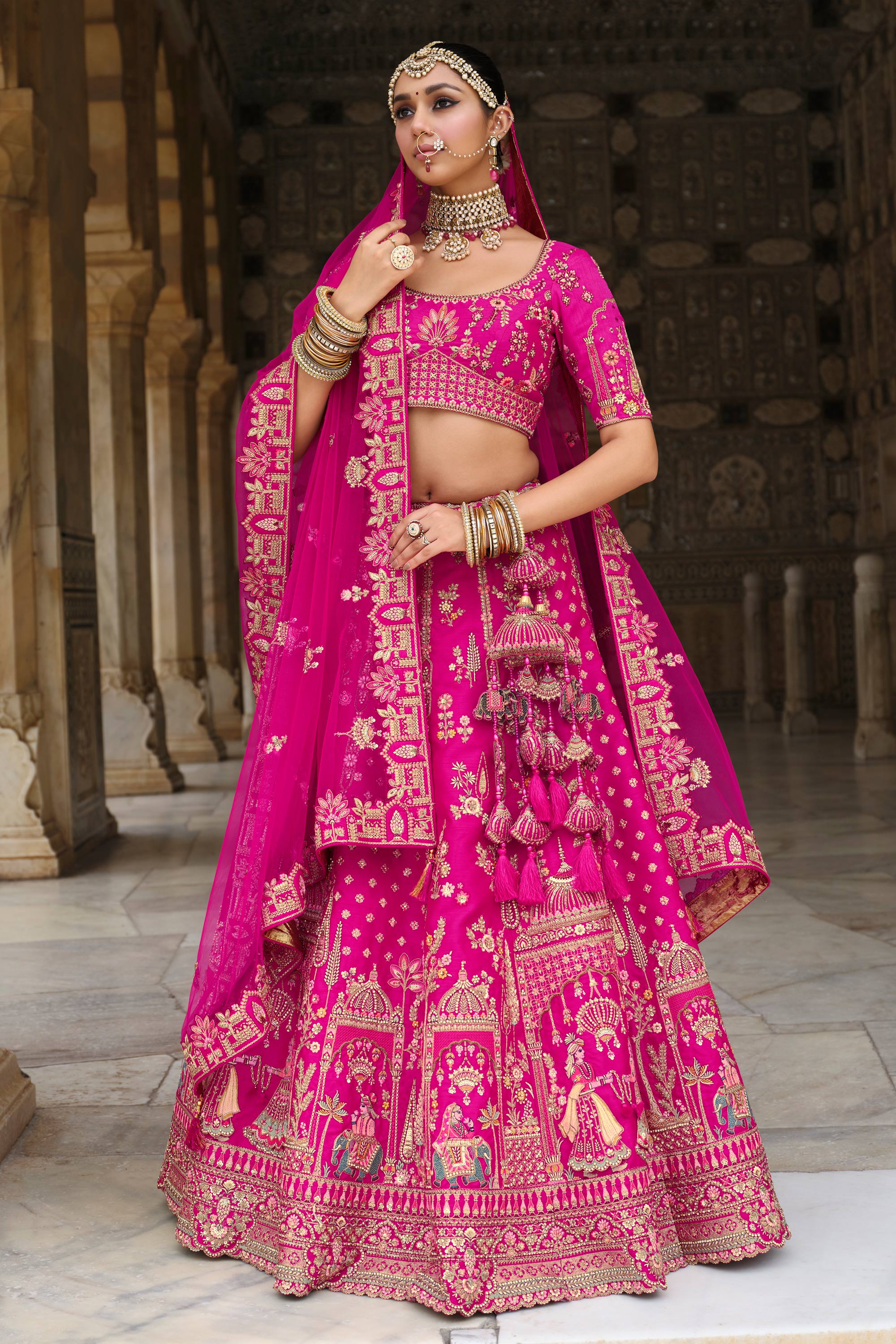 Step into the spotlight on your special day with this Silk Bridal Lehenga Set, paired with an exquisite embroidered blouse. Perfectly tailored for modern brides, this outfit showcases masterful embroidery on smooth, flowing silk fabric. Whether it's the shimmering detail on the blouse or the rich textures of the lehenga, this set delivers unparalleled charm. Made for all-day comfort without compromising style, it's a perfect blend of grace and fashion for traditional and contemporary ceremonies alike. Make unforgettable memories in this enchanting bridal wear.