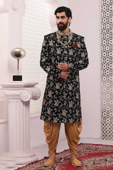 Magnificent Black Color Velvet Fabric Heavy Embroidered Designer Groom Sherwani
