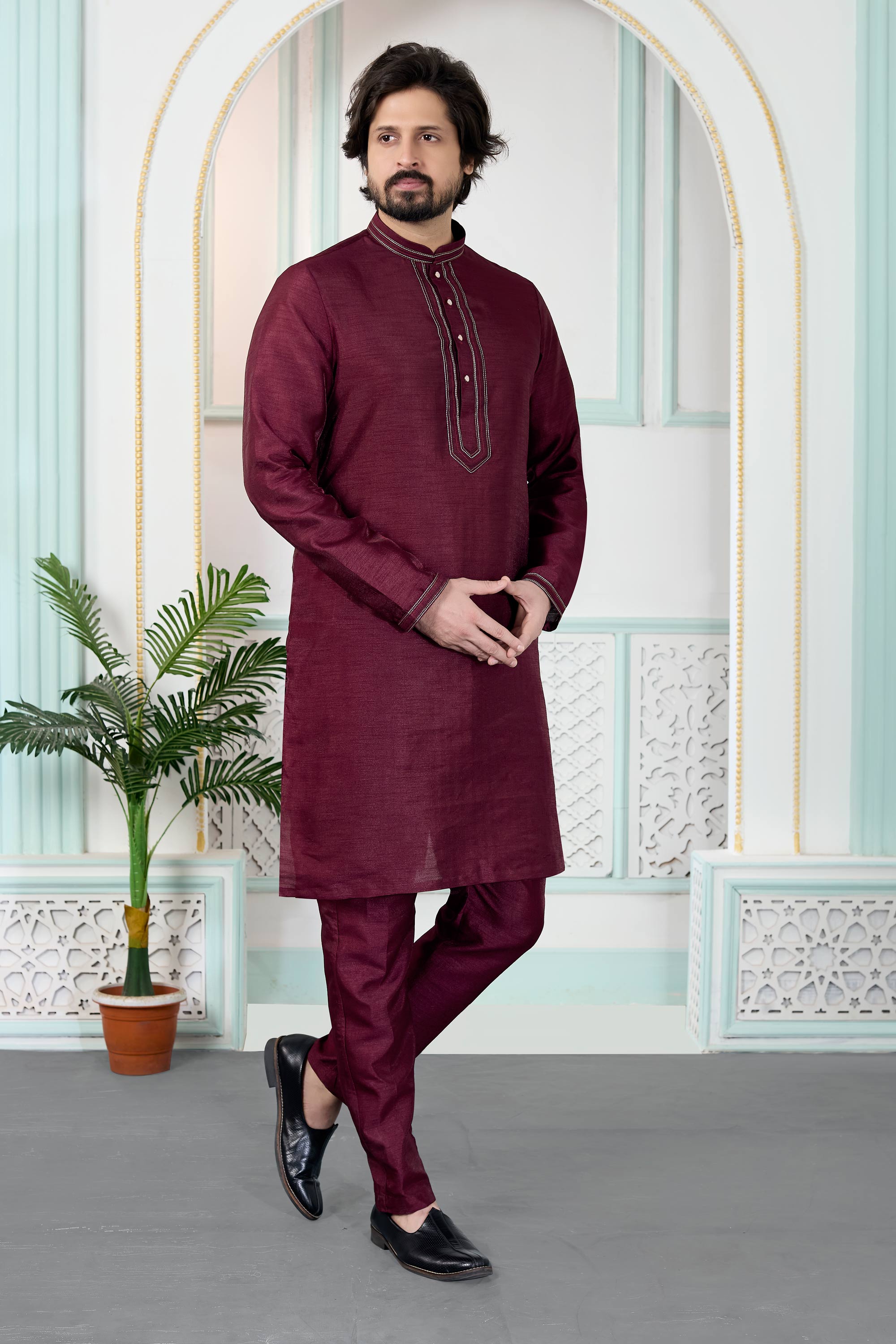 Maroon Art Silk Fabric Function Wear Readymade Kurta Pyjama For Men
