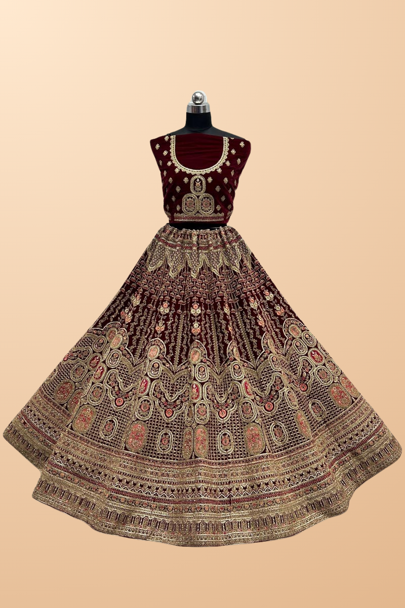 Maroon Color Exquisite Thread Embroidered Bridal Lehenga In Velvet Fabric