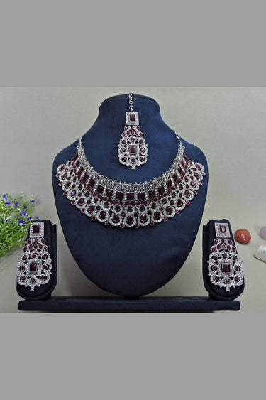 Maroon Color Riveting Alloy Necklace With Earrings and Mang Tikka