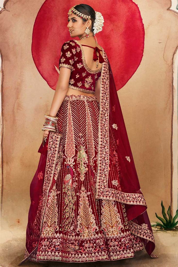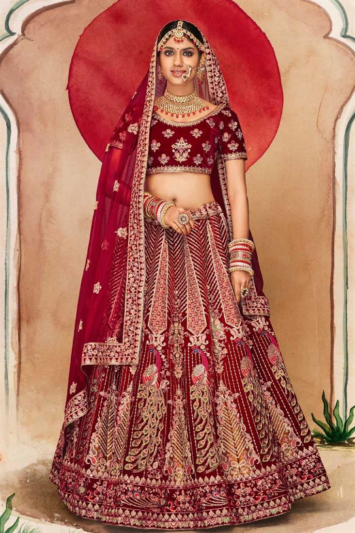 Maroon Color Velvet Fabric Wedding Look Embellished Bridal Lehenga