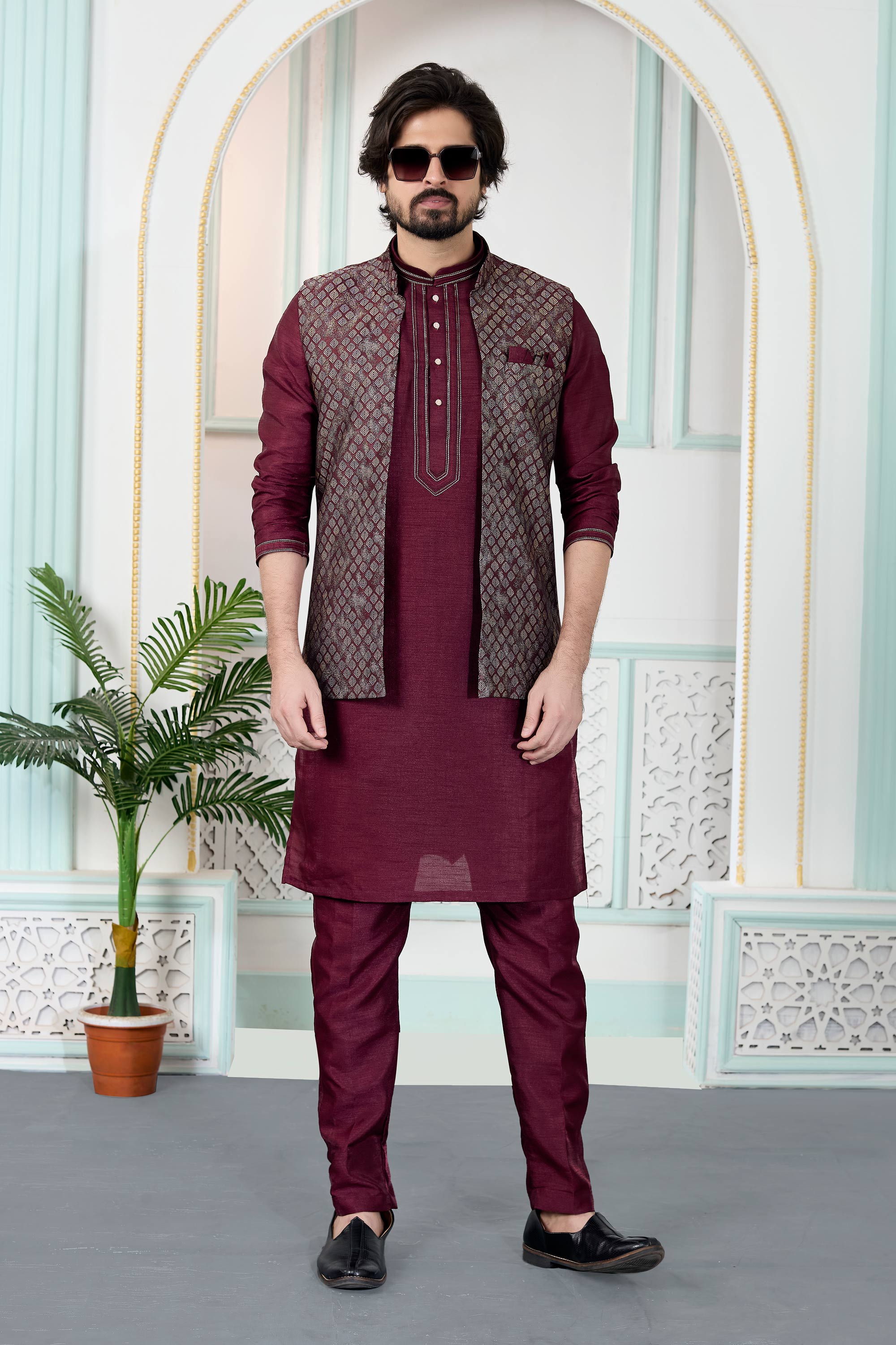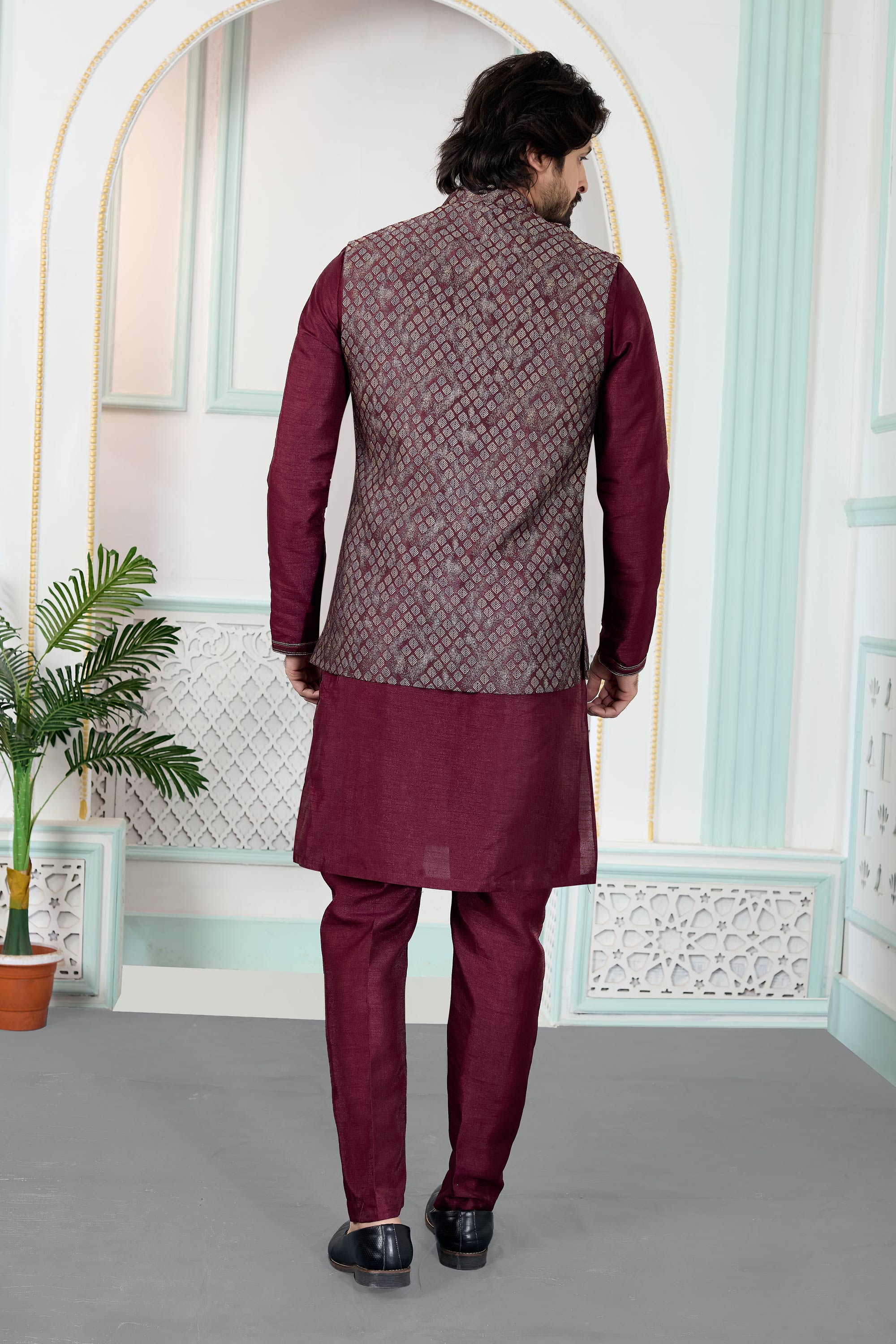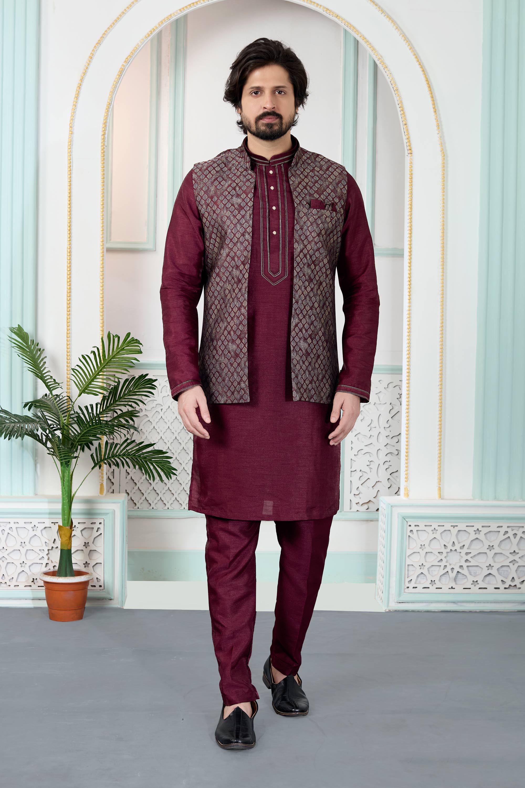 Make a graceful statement with this Mens Kurta, Aligadhi Pant, and Jacket Ensemble, perfect for wedding ceremonies and special events. The jacquard kurta delivers a luxurious texture, complemented by an art Banarasi silk Aligadhi pant for added elegance. Finished with a faux satinlined jacket for a polished fit, this outfit may show slight color variations due to digital photography.