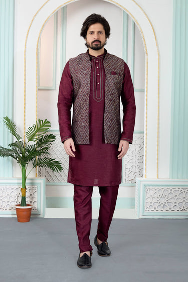 Maroon Wedding Wear Jacquard Readymade Kurta And Aligadhi Pant For Men