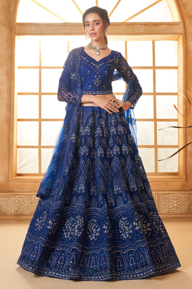Step into elegance with our designer Lehenga Choli in exquisite hues. Made from soft net fabric, both the lehenga and blouse provide comfort without compromising on style. Paired with a soft net dupatta, the outfit is adorned with heavy designer thread embroidery and diamond work, making it perfect for wedding wear. Available for customization up to size 42. Recommended for dry cleaning to maintain its beauty. Note: Accessories shown are for presentation only and not included. The product color may slightly vary due to photography effects or display settings. Ships in 10 working days.