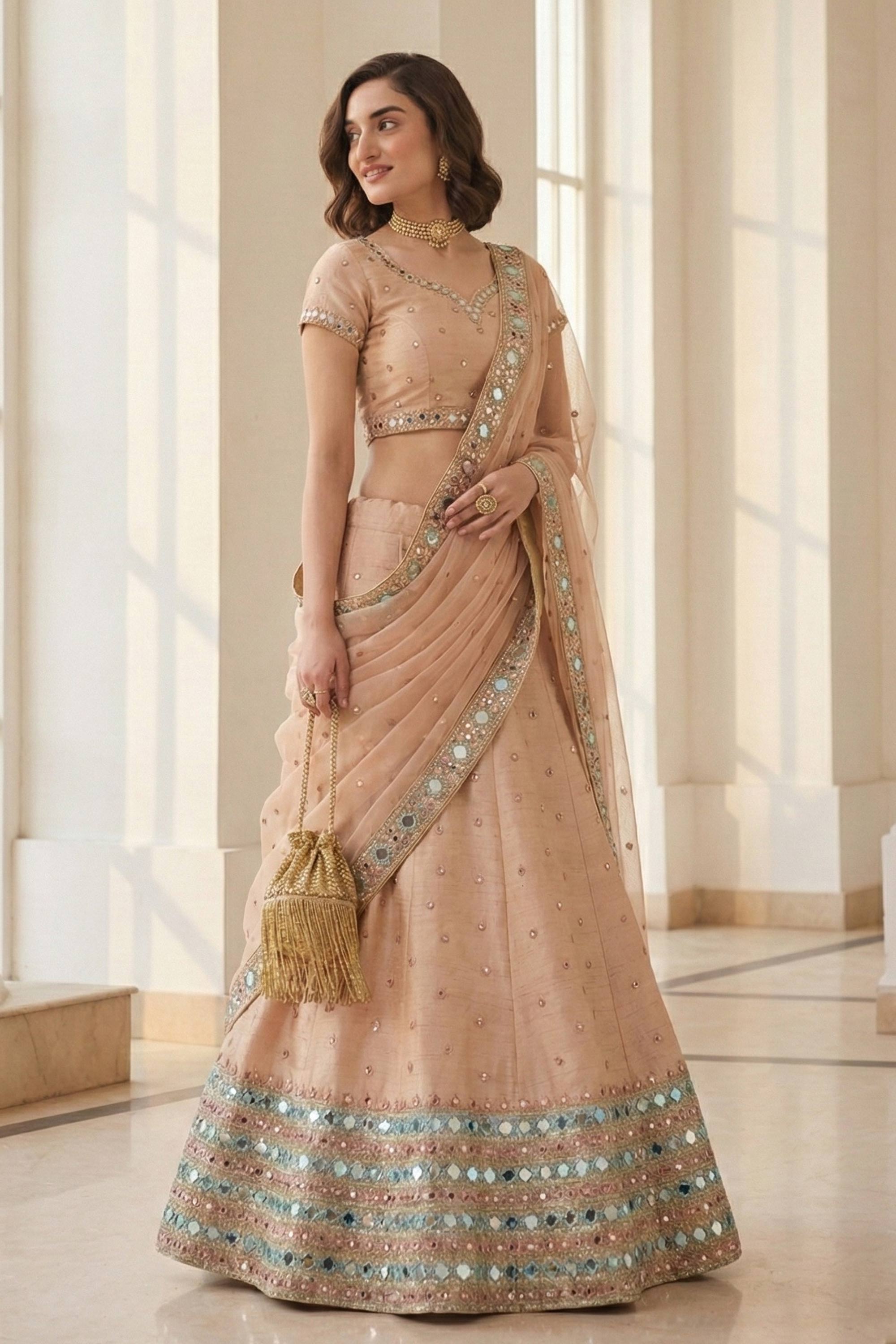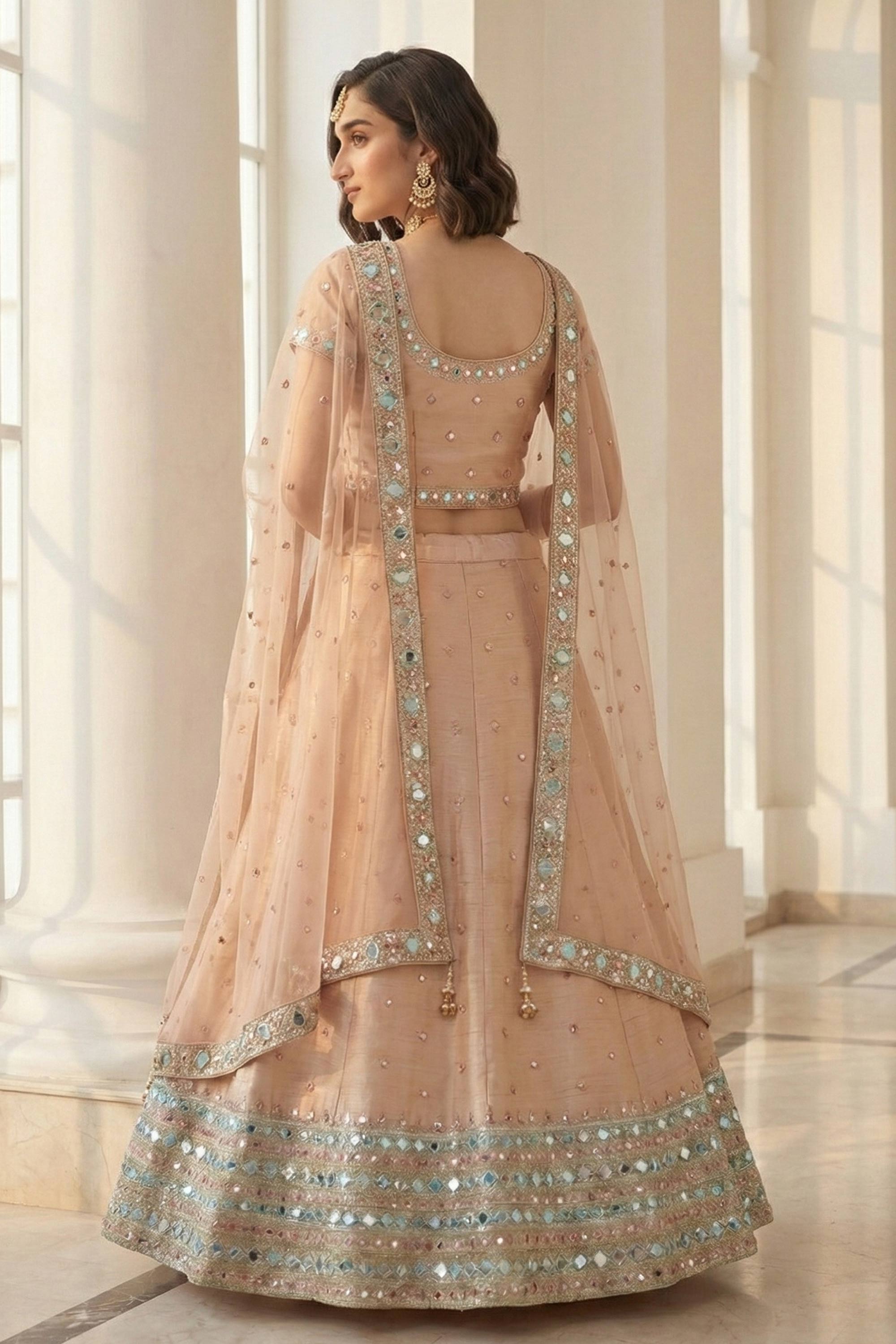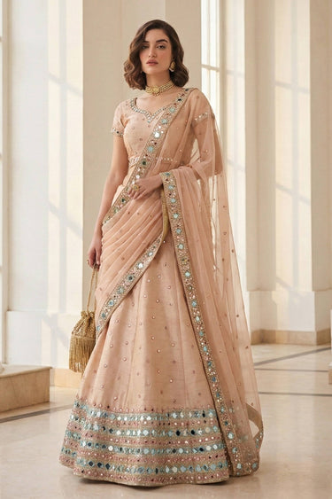 Mirror Work Peach Silk Lehenga Choli For Wedding Wear