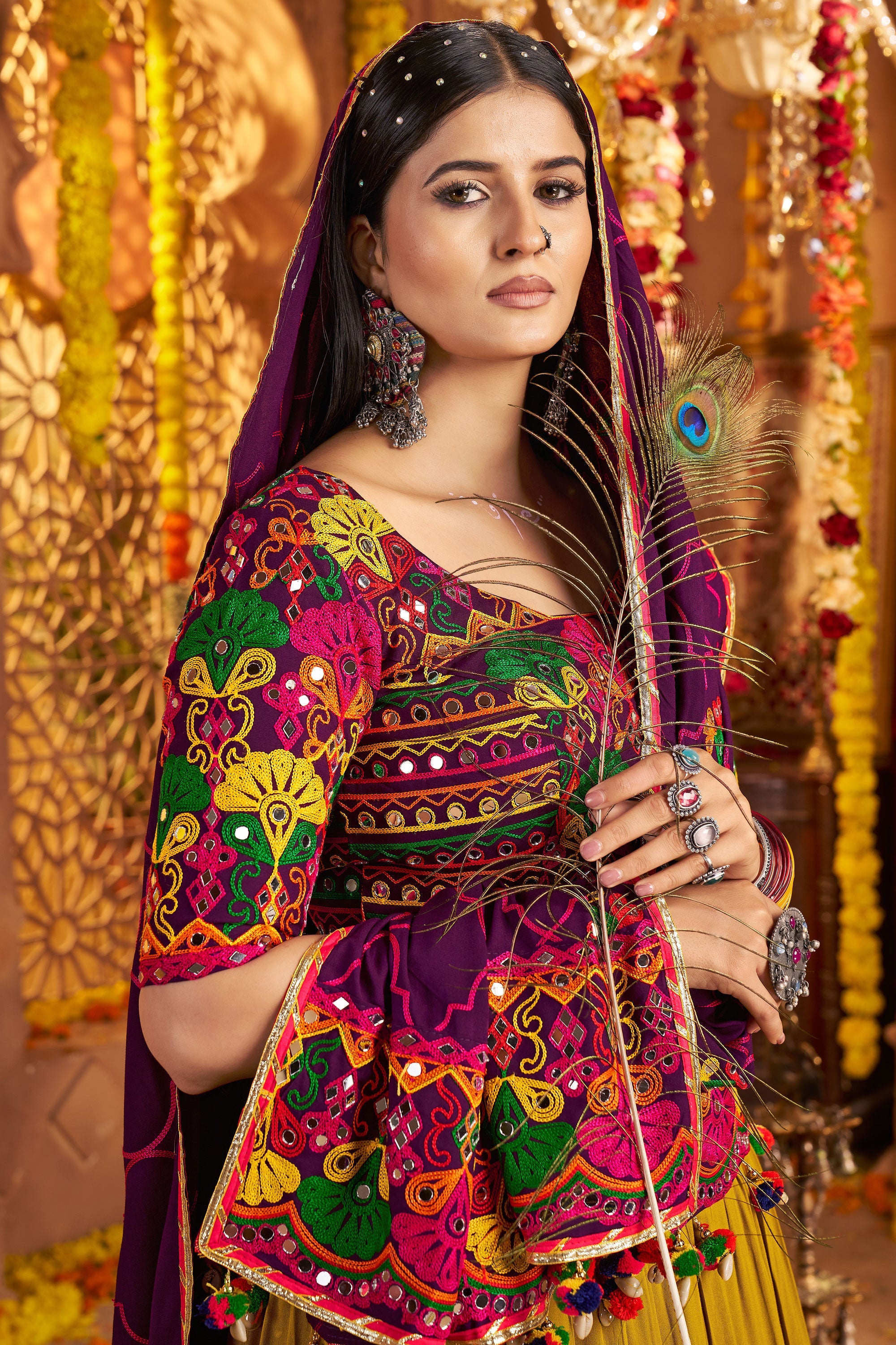 Adorn yourself with our Multi Color Cotton Viscose Embroidered Mirror Work Gamthi Work Navratri Special Chaniya Choli. Perfect for the festive season, this attire combines traditional design with contemporary comfort. The cotton-viscose fabric blend provides a soft and comfortable feel, while the detailed mirror work and embroidery offer a stunning visual appeal. Whether you're dancing the night away at a garba event or celebrating with family, this chaniya choli is the ideal choice. Available in multiple sizes, order now to add a touch of tradition to your wardrobe.