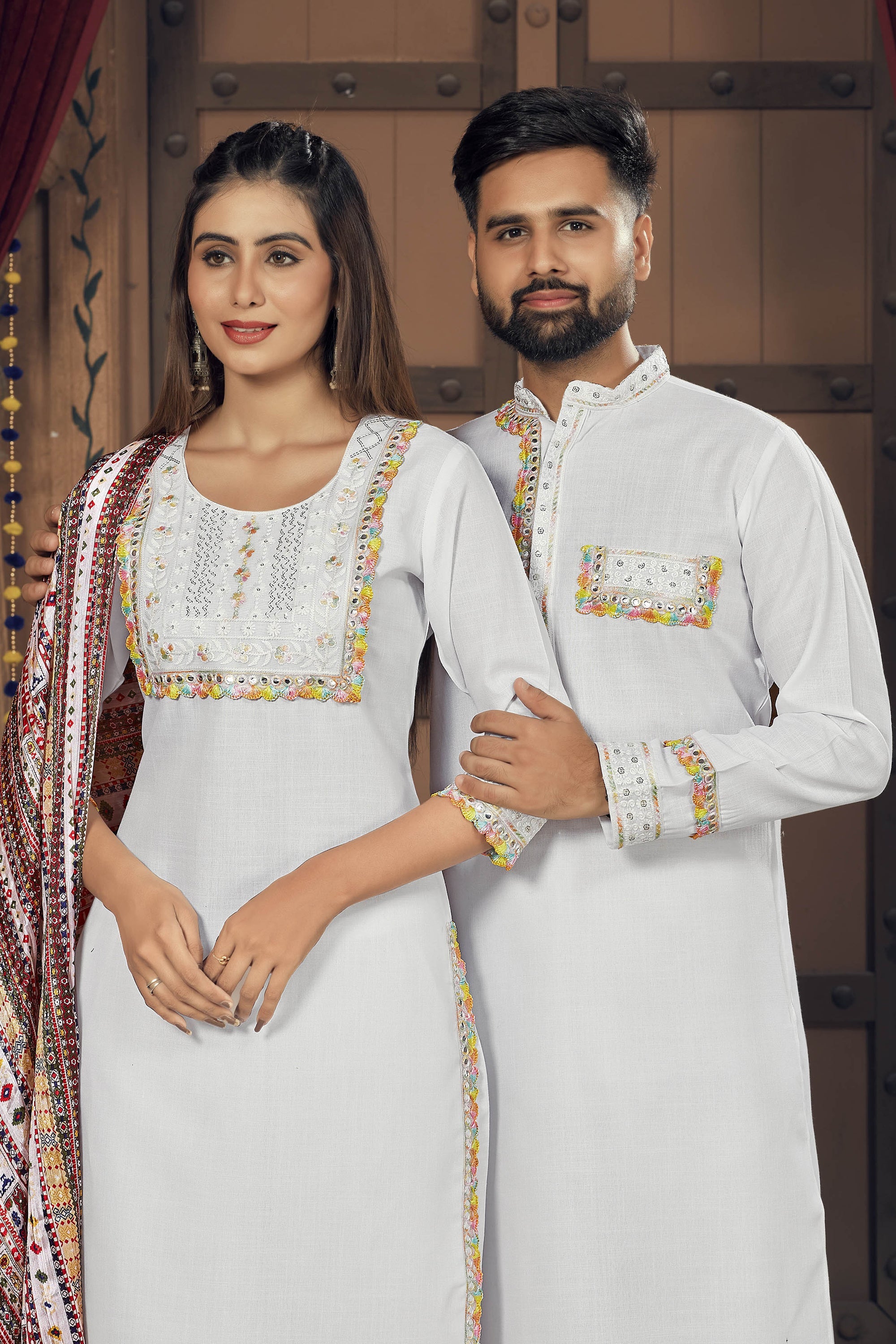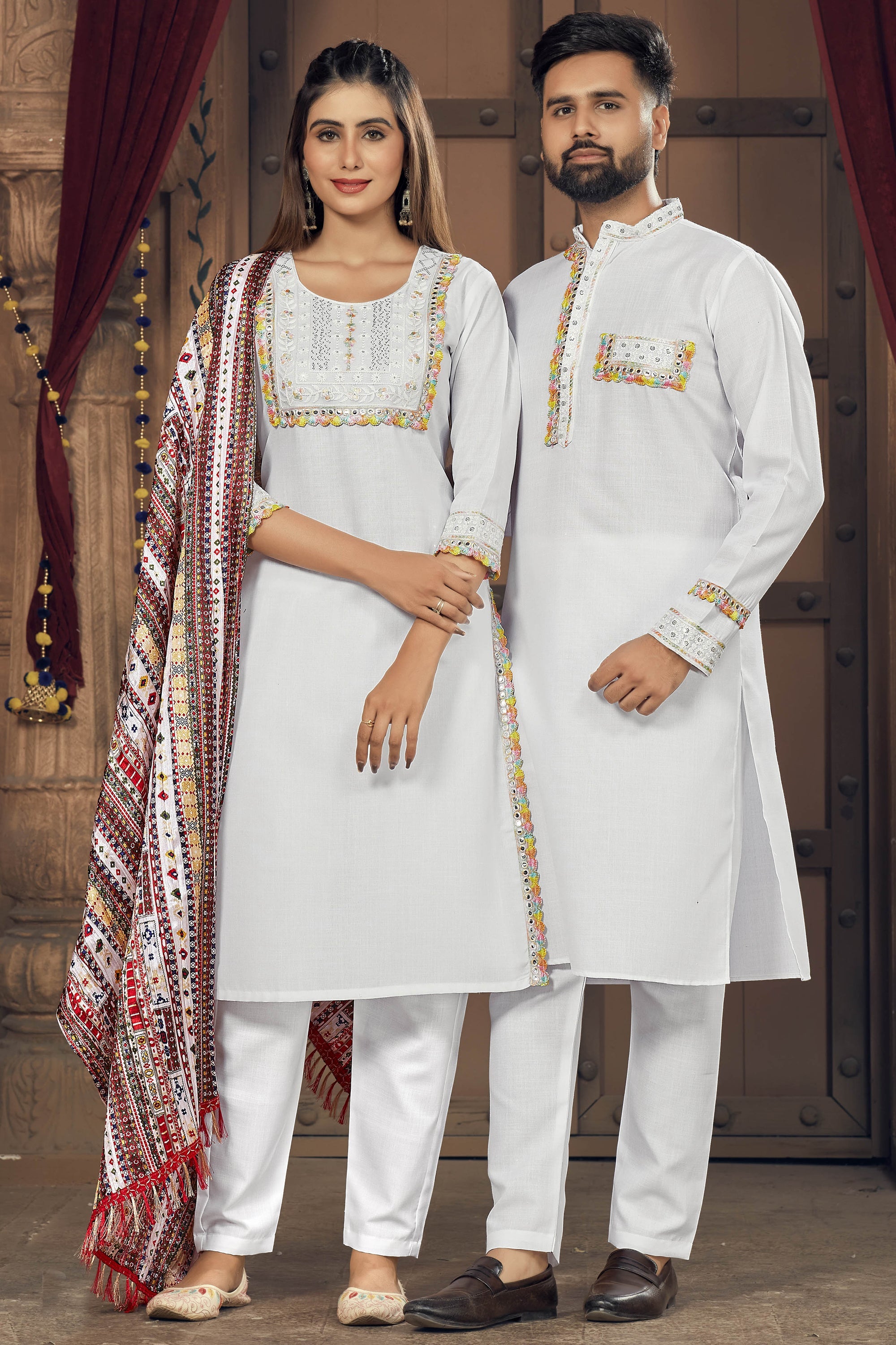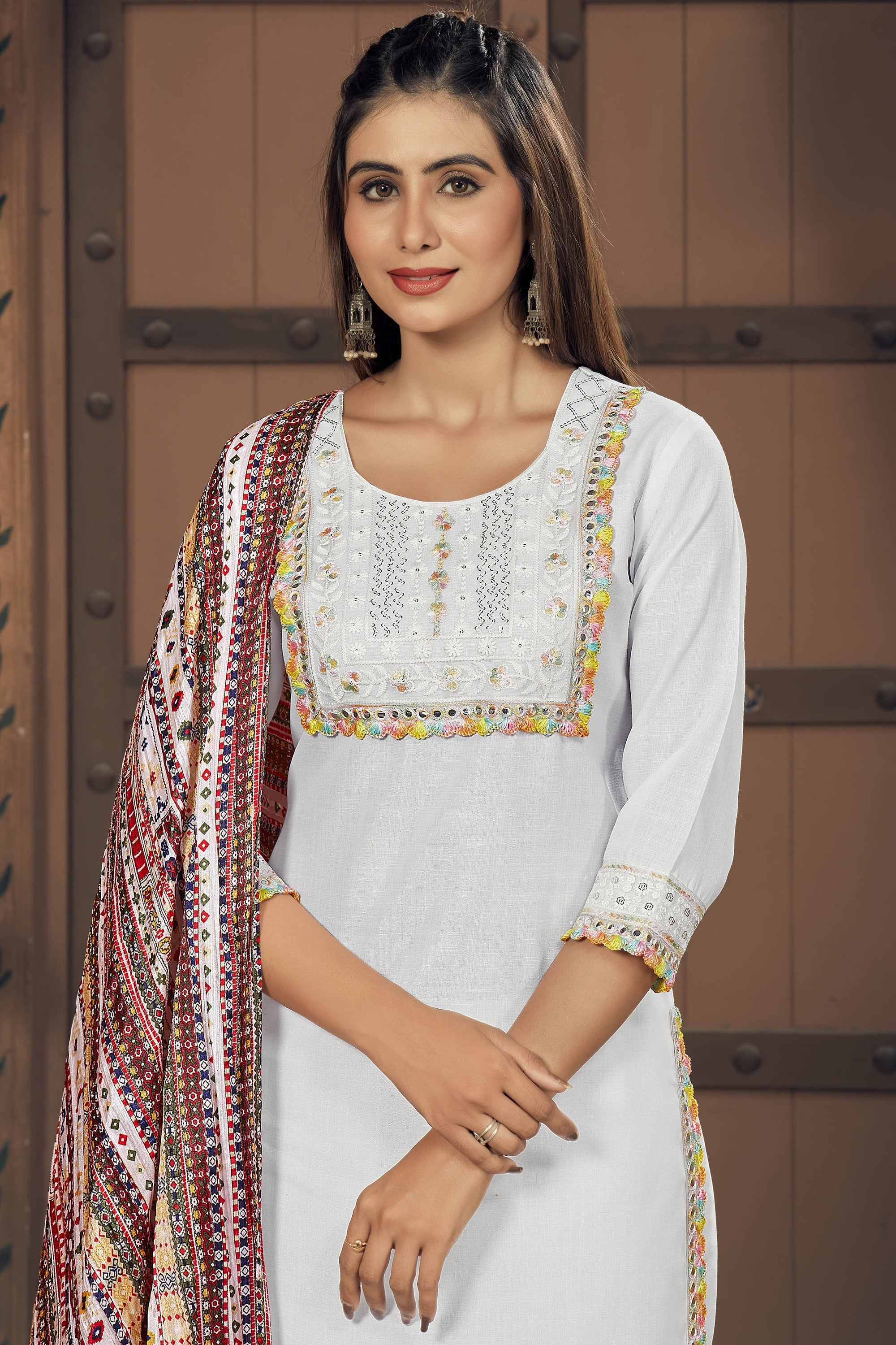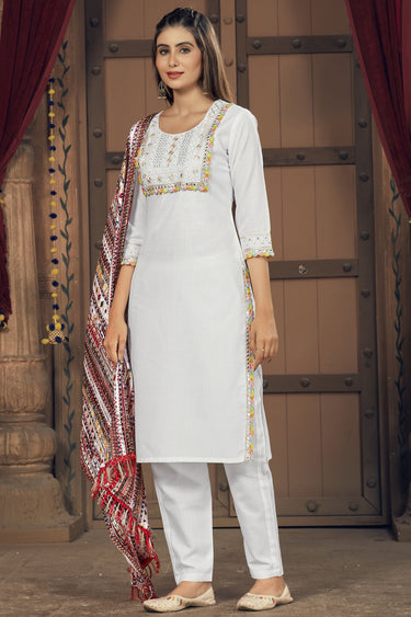 Navratri Special Embroidered Readymade Designer Salwar Kameez In Cotton Fabric White Color